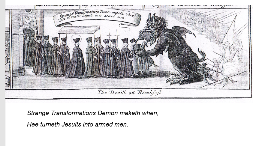 The verse clearly implies that this devil ingests Jesuits and other Catholic clergy, then forth he doth shite them, in the formof soldiers for the conquest of Protestant England. And it is significant that, though not unmistakably depicted as such, i.e. not in the characteristic bonnet, the text of the print regards the men being devoured as Jesuits.