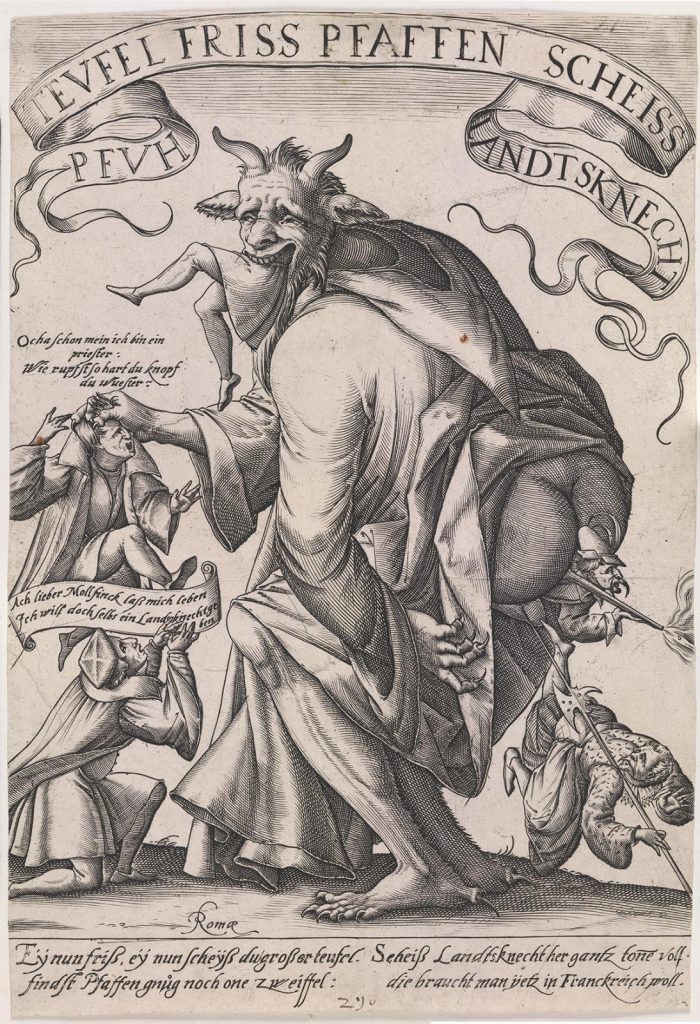 Pfvh Tevfel Friss Pfaffen Scheiss Landtsknecht [Pooh! Devil eats priests, shits soldiers], shows the Devil in the process of devouring three Jesuit priests and excreting them as soldiers.