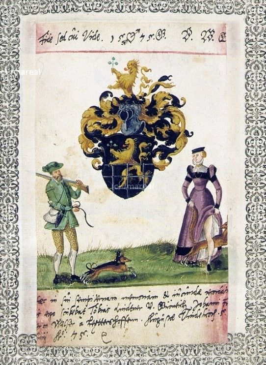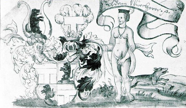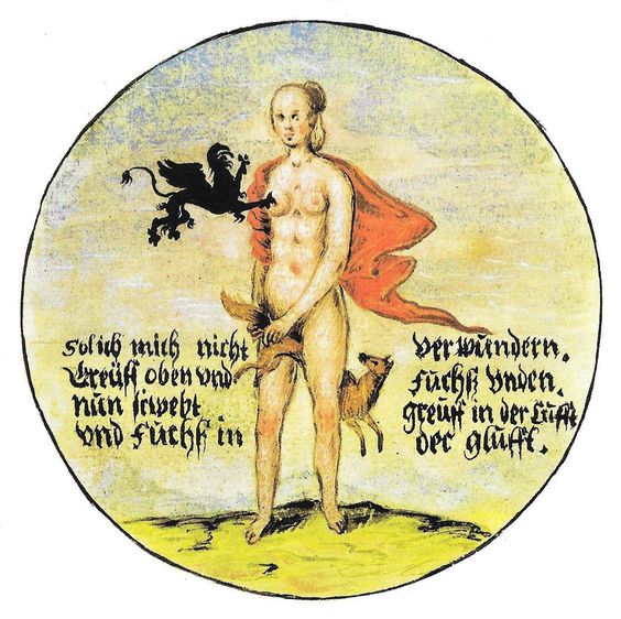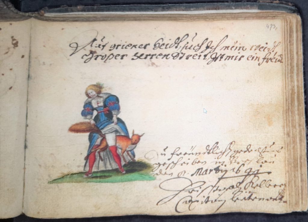 The earliest example of the motif in the albums I have noticed to date is a fully clothed woman painted in 1575 in the Welser abum which according to the invaluable online Repertorium Alborum Amicorum is still in the possession of the Welser family. (I owe this image to the Salzburg Institut fur Realienkunde website)