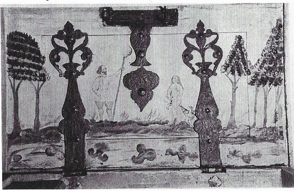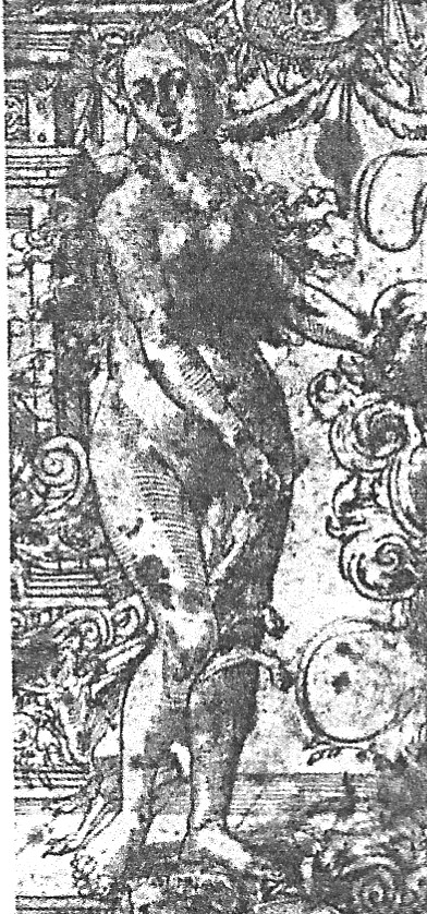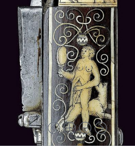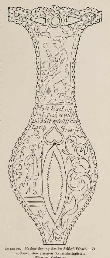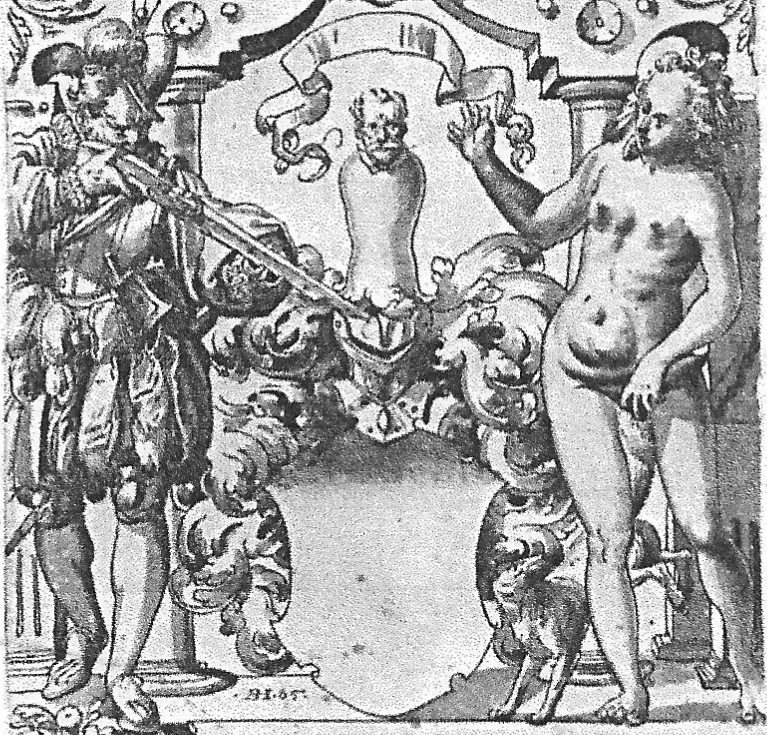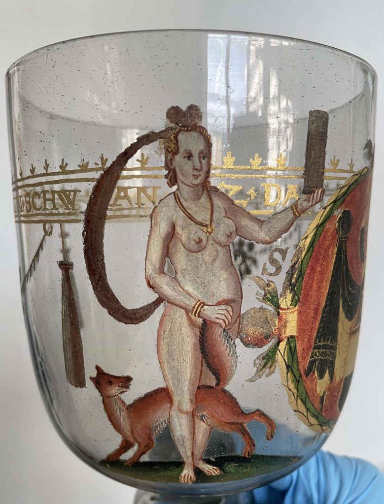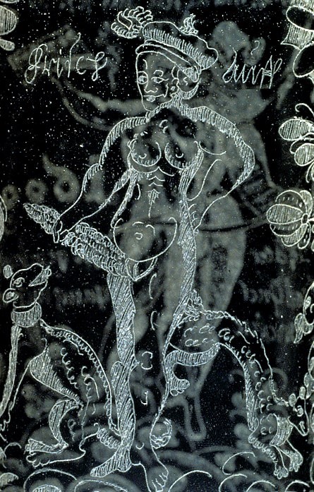 In the 17C the motif is to be found in an increasing range of media, as one of the numerous ‘Schnacken’ painted on ceilings (see Wroclaw ceiling detail below), and engraved on items of wood, metal (including a ‘chastity-belt’ if not a 19C fake — SEE BELOW), and glassware — including the remarkable Getty Stangenglas on which it features with similar ‘erotic’ motifs. It is also in the 17C that it is taken up by the print-books and single-sheet prints