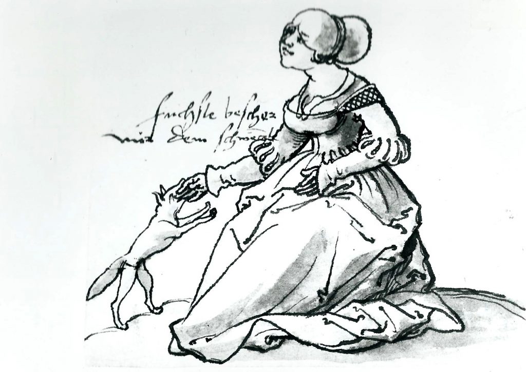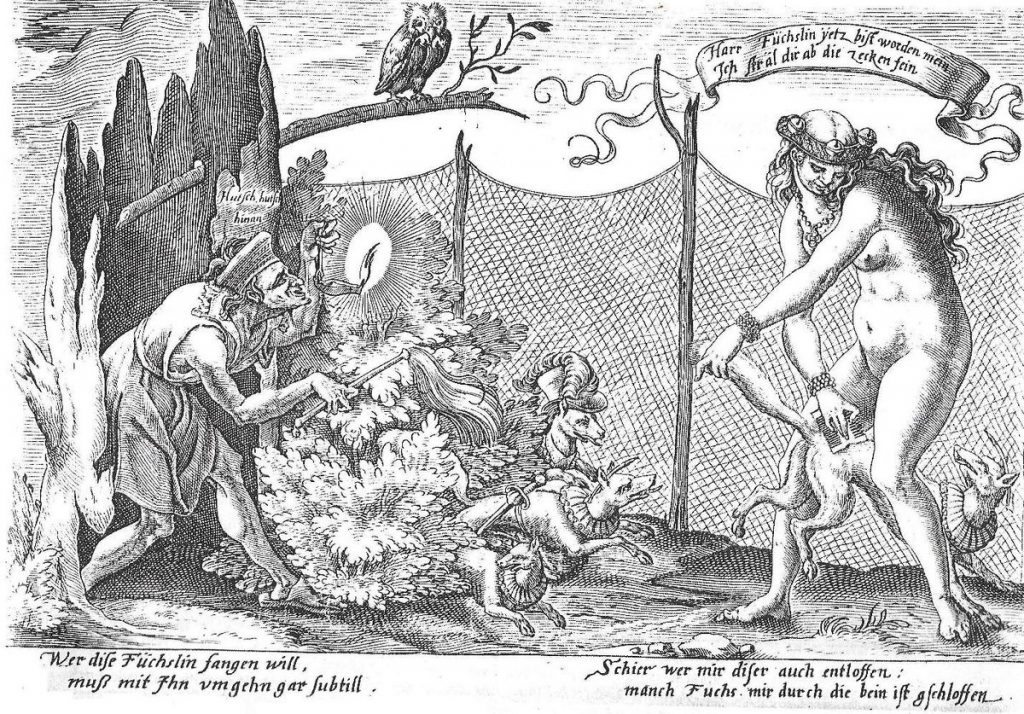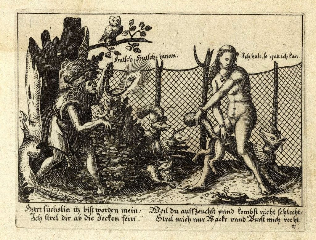 The seated young woman whose fingers appear to be nibbled by the fox says, Fuchsle bescher mir dein schwenzle [Foxy, make me a present of your lite tail]. As in many other vernaculars, the ‘tail’ word is a common euphemism for penis.
