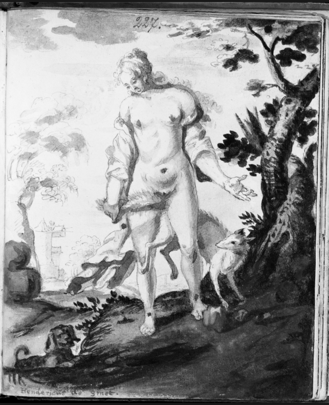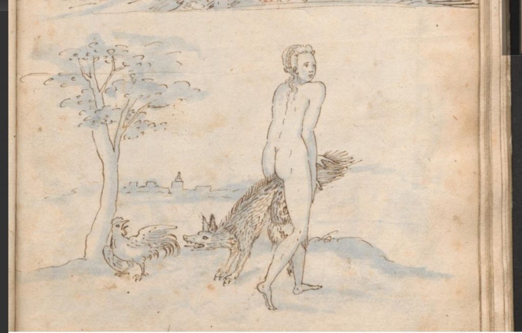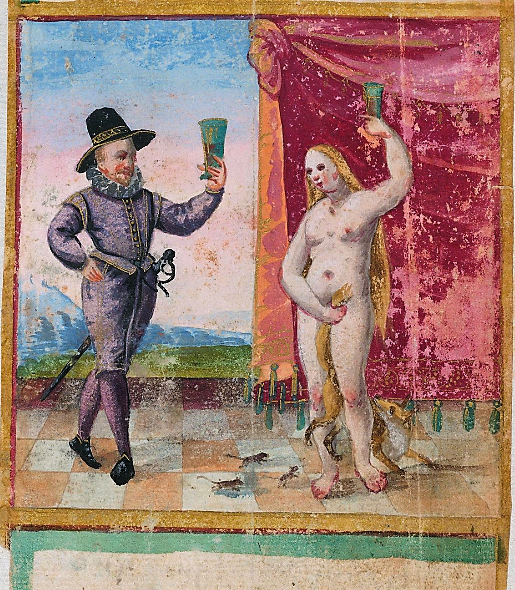 Ostensibly a hunting scene, the huntsman’s two hounds are chasing the fox which runs through the lady’s legs who lifts up her skirt with one hand to allow it passage, fully exposing her bare leg, while her other hand grips the tip of the foxtail. Contemporary (c.1580) is a similar foxhunting scene in the album of Christen Holck (now in Copenhagen), though here the lady who grasps the tip of the foxtail is entirely naked — but for a hat! There must surely be contemporary literary reflexes of this erotic metaphor but I have yet to notice one. (Readers, please?!)