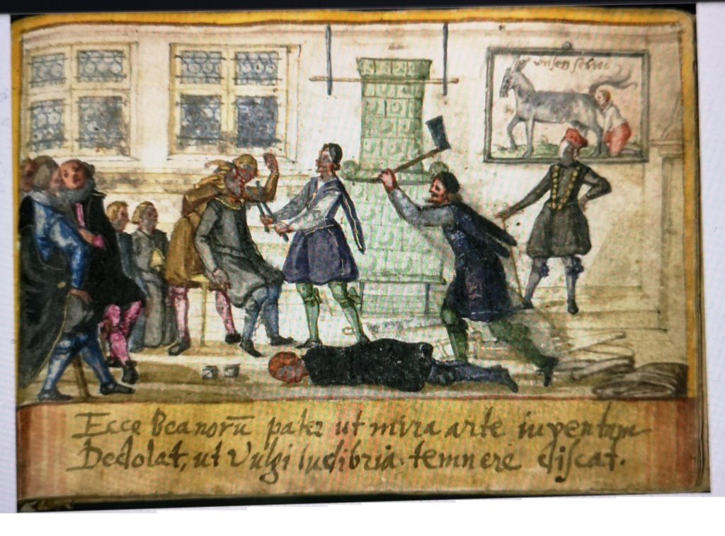 One colourful aspect of student life registered in the print-books is the initiation or ‘hazing’ ritual to which new students were subjected. The so-called Depositio appears in the Pugillus Facetiarum (Strasbourg 1608, 1618) and also in de Passe’s Academia sive Speculum Vitae Scolasticae (Arnhem 1612),[i] and the miniature in the Frolich album clearly copies the former, but the painting in the Spoerlin album (dated 1622) depends on neither of these print models.[ii] In a room heated by a Kachelofen and before an invited audience, two bejaunes/beani [initiates] undergo different symbolic rites – one lying on the floor is about to be ‘trimmed’ by a man wielding an axe, another wearing a fool’s hood and seated in a chair is about to have his ‘tusks’ drawn with an alarming pair of pliers. When the new savage monsters have been thus tamed and rendered harmless they will then be considered civilised enough to join the student body. But a detail just as interesting as the ritual itself, is the unremarked painting on the wall. It shows a man/student kneeling before the rump of an ass and holding its tail up so that he can kiss its arse! The picture is inscribed vnser seind [drey] [There’s three of us — i.e. ass, initiate, viewer] and is a traditional visual joke at the viewer’s expense, found in the albums elsewhere in its own right.