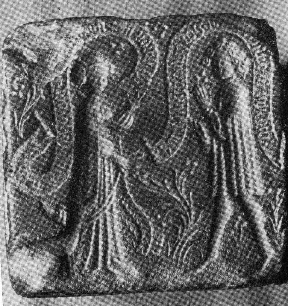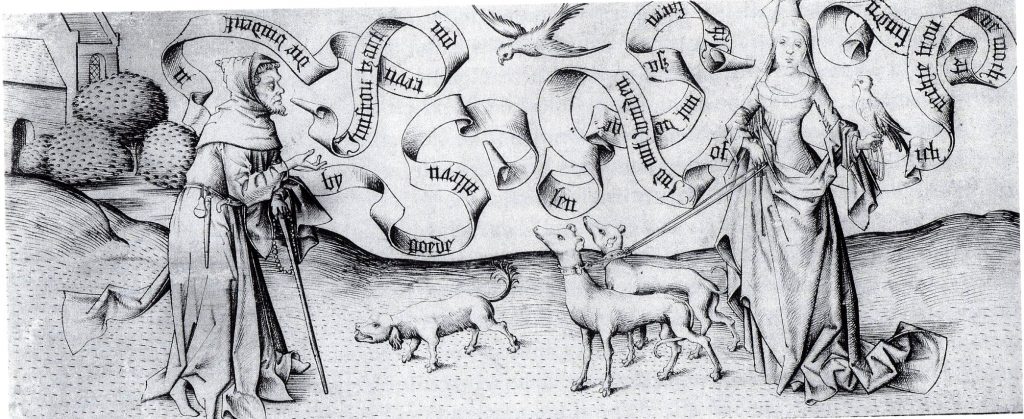 The earliest I have noticed this motif is on a biscuit-mould made c.1425 in the Historisches Museum, Frankfurt. My reading (based on Fritz Arens, “Die ursprungliche Verwendung gotischer Stein- und Tonmodel” in Mainzer Zeitschrift 66 (1971),115 ): Ich iagen mit wind[en]/ wo sol ich tr[ewe finden] [I hunt with greyhounds/ where shall I find Fidelity?] The young man’s response is not entirely legible, but opens zarte iuncfrawe [tender maiden] and ends ist wyslich [is wise], so perhaps offers her the same cold comfort as the hermit.
