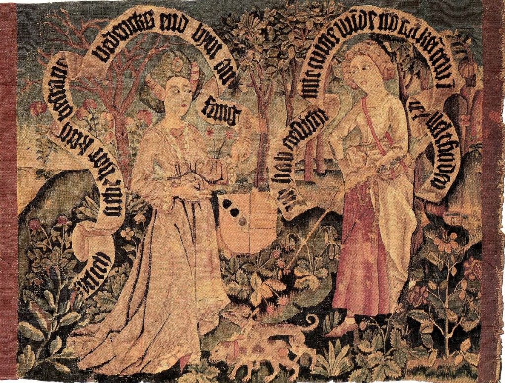 In this tapestry cushion-cover woven in Strasbourg c.1480, the Lady says, Ich hab gesucht mit mine[n] wi[n]de[n]/ ich ka[n] kei[n] tr[e]w i[n] der velt finden. [I have searched with my greyhounds/ I can find no fidelity in the world], to which the older woman responds proverbially and discouraginly! zytlich liebe hat kein bestand/ bedencks end bym anfang [temporal love does not endure, think on the end at the beginning].