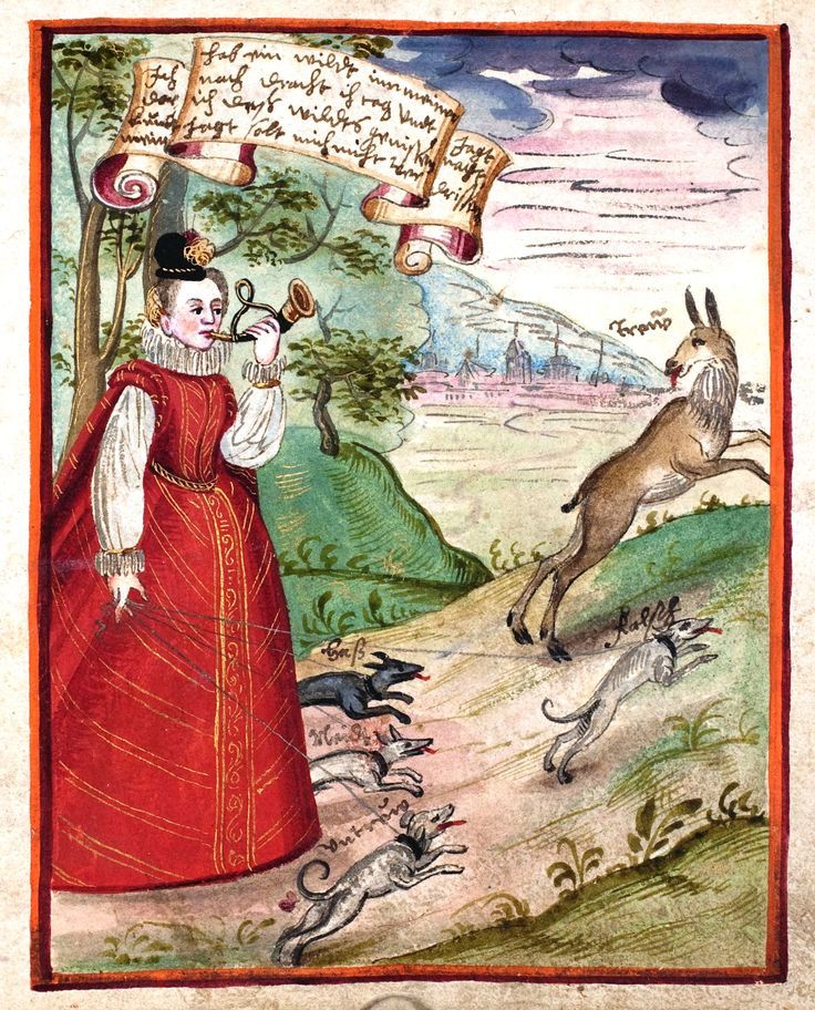 from the album of Andreas Huber (dated entries 1587-1609). Stuttgart, WLB, cod. don. 899, f.150r. The deer is labelled Treue [Fidelity], the hounds are named Hass [hatred], Neidt [Envy], Falsch [Falsehood] and Vntreue [Infidelity] — no wonder the deer is making a run for it! Not quite sure how this allegory works logically — if these are the Lady’s dogs, as they must surely be, why does she hope to capture Fidelity with them?