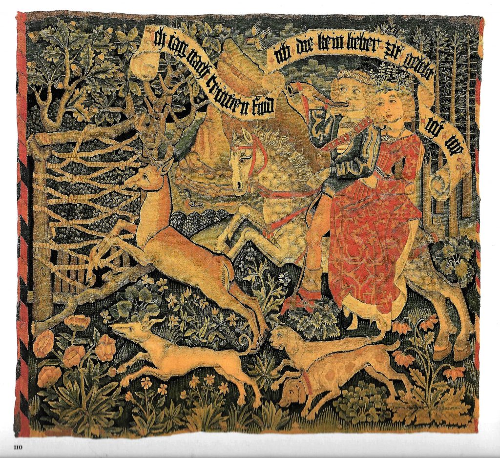 Another roughly contemporary late 15C Strasbourg tapestry in Glasgow’s Burrell Collection shows a young couple hunting Fidelity, here the banderole reads Ich iag nach truwen find ich die kein lieber zit gelebt ich nie [I’m hunting for fidelity, if I find it, I’ll never enjoy a pleasanter time]
