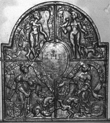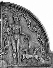 This remarkable cast-iron fireback, signed by the maker SB, was made in the Saarland in the 1590s, and is thus contemporary with the album images. It is the top right bquadrant in which we are interested here, the (naked!) Lady’s banderole reads ICH IACE [sic] OM DIE WINDEN OFT ICH TROVE KONDEN VINDEN [I hunt with greyhounds (to see) whether I can find fidelity]. Several examples are known, this is part of the Kremer collection (available online)