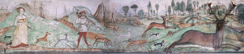 Part of an 8m-long Jagd nach der Treue painted by Jakob Boden in Diessenhofen, Switzerland, in 1535. The Lady says, Ich bin ein jegerin von edler artt / und volgen, minem lieben ieger, intrywen nach uff vartt [I am a huntress of noble kind and follow my beloved huntsman …. I look forward to learning how the other banderoles read — especially that of the stag (best photos I could find).