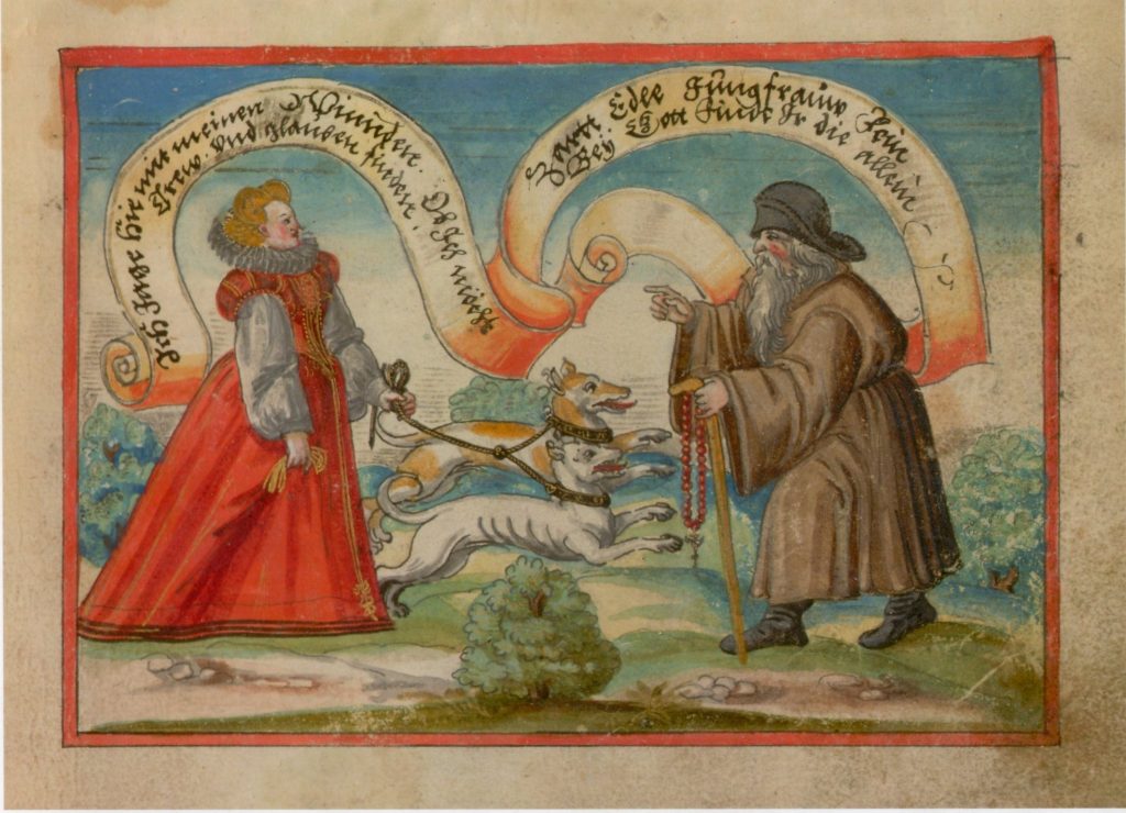 from the album of Daniel von Redern (dated entries 1589-1613). Stockholm, KB, Ir 2a, f.12v. Lady: Ich jage hie mit meinen Winnden / Ob ich mocht Trew Vnd glauben finden [I’m hunting here with my hounds/ so I might find fidelity and belief] Hermit: Zartt Edle Jungfrauw fein / Beij Gott findt Ir die allein [Tender and noble maiden/ you will find it only in God]