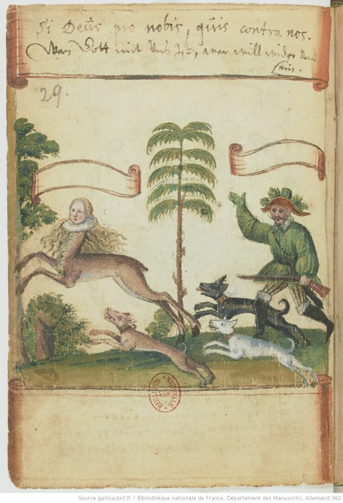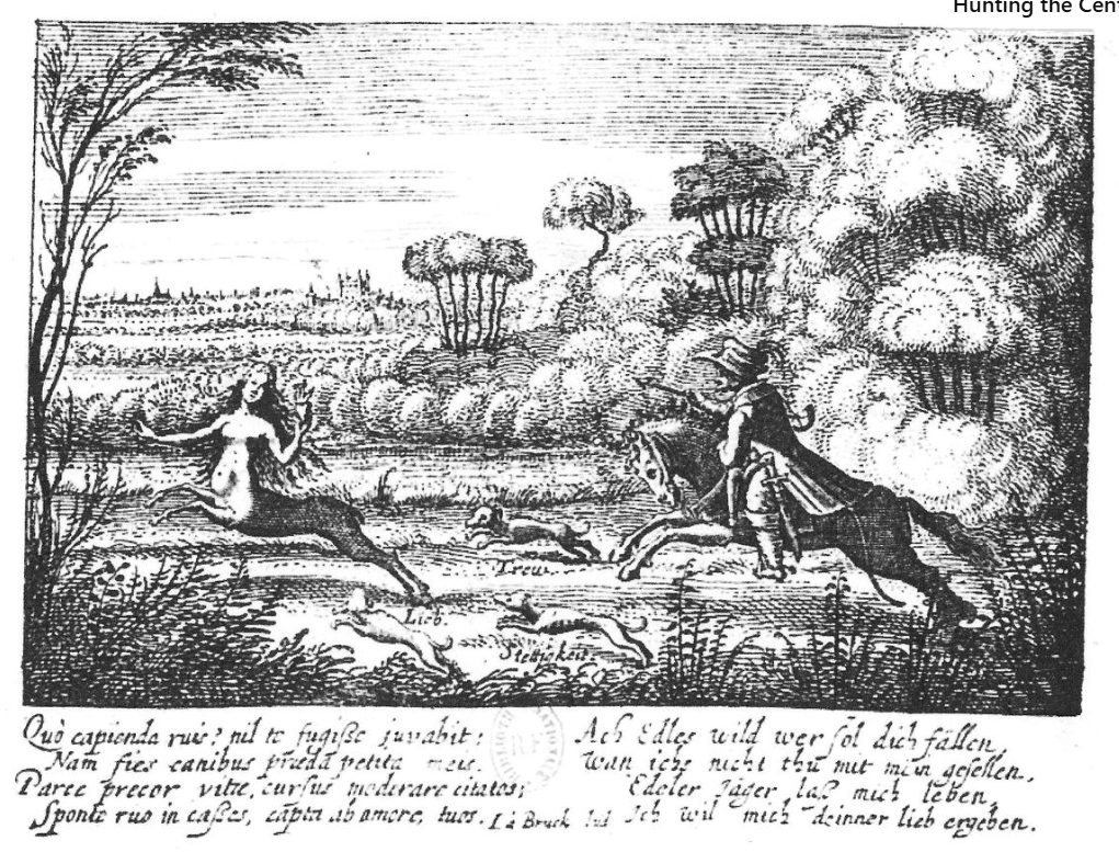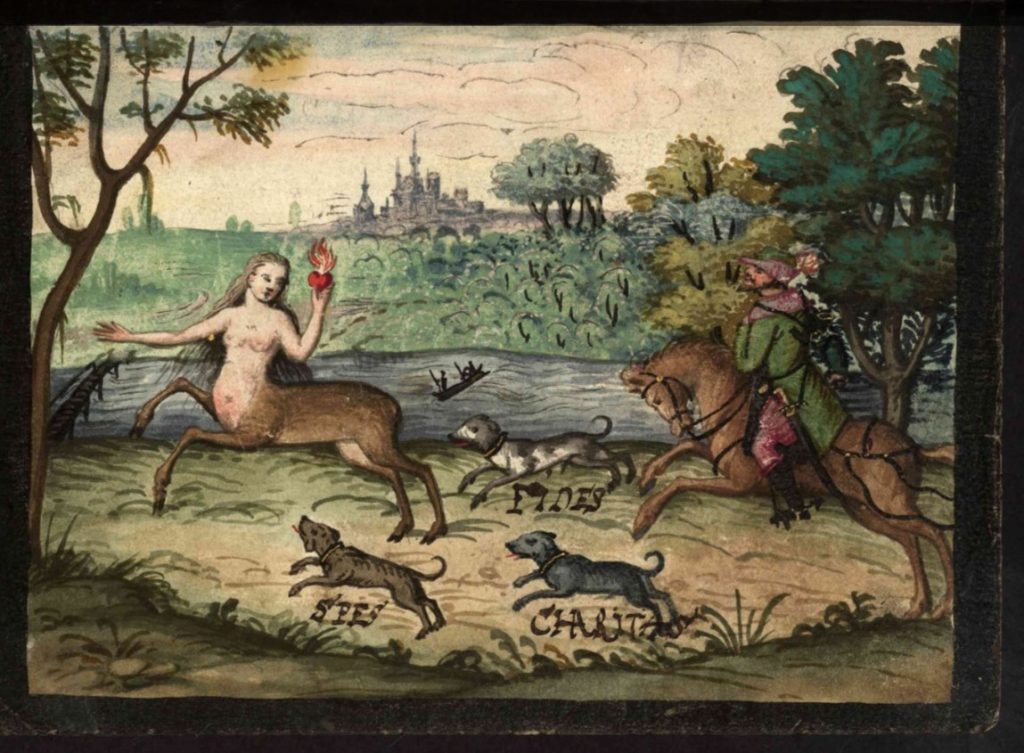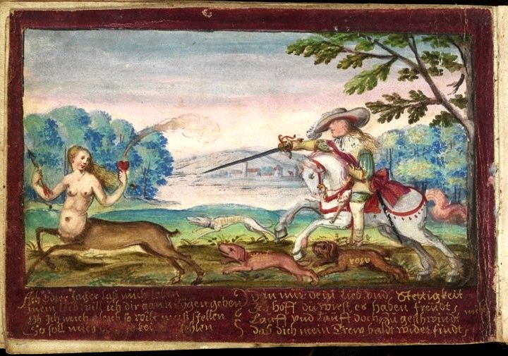 as far as I can see, a motif limited exclusively to the early 17C alba amicorum of German students, and deriving from an engraving in the print-books published in Strasbourg in 1618 by Jakob von der Heyden (i.e. the Speculum Cornelianum and the 2nd ed of the Pugillus Facetiarum — insofaras these are not in fact the same book). The huntsman’s dogs are named Trew [Fidelity], Lieb [Love] and Stettigkeit [Constancy] — cf. the names of the hounds of the young woman who goes hunting for Fidelity in my post on that topic. The verse here is signed by the neo-Latin poet, Iakob a Bruck. Note that the centauress holds a flaming heart in one hand — shown only in the Kunasch von Machovic and Zorer examples, however, as in the others she is depicted armless. The verse expresses her willingness to surrender to the huntsman’s love.