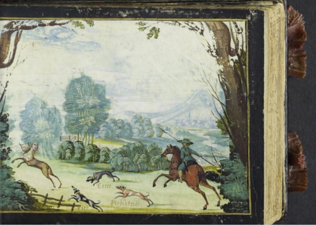 The situation is not quite as simple as this, however, as the earliest example in the Johann Mullegg album (dated entries 1596-1612) predates the print and the huntsman is on foot, so that clearly the motif was already in existence before Jakob von der Heyden published his equestrian version. The only hound’s name that can be read is Bestendigkeit which while not identical is however synonymous with the Stettigkeit of the later version. And while 4 of the 5 examples below which clearly derive from the print-book are in the same direction as the engraving, the Grossmann painting is in reverse, perhaps implying a (lost) copy of the print.