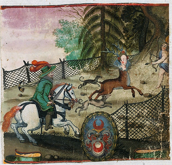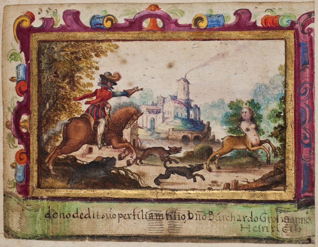 And f.42v. of the Heinrich Julius von Arnstedt album (dated entries 1610-17) is described in the RAA as Gouache: Jagdszene mit hinter Kentaur herbreschendem Jäger und Hunden. Im Hintergrund Landschaft mit Schloss. And thirdly, an 18C example is to be found pasted onto p.256 of the album of Hieronymus Conrad Wagner (dated entries 1754-70), according to Schnabel’s catalogue of the albums in the Nurnberg Stadtbibliothek [Amb. 3429. octavo]