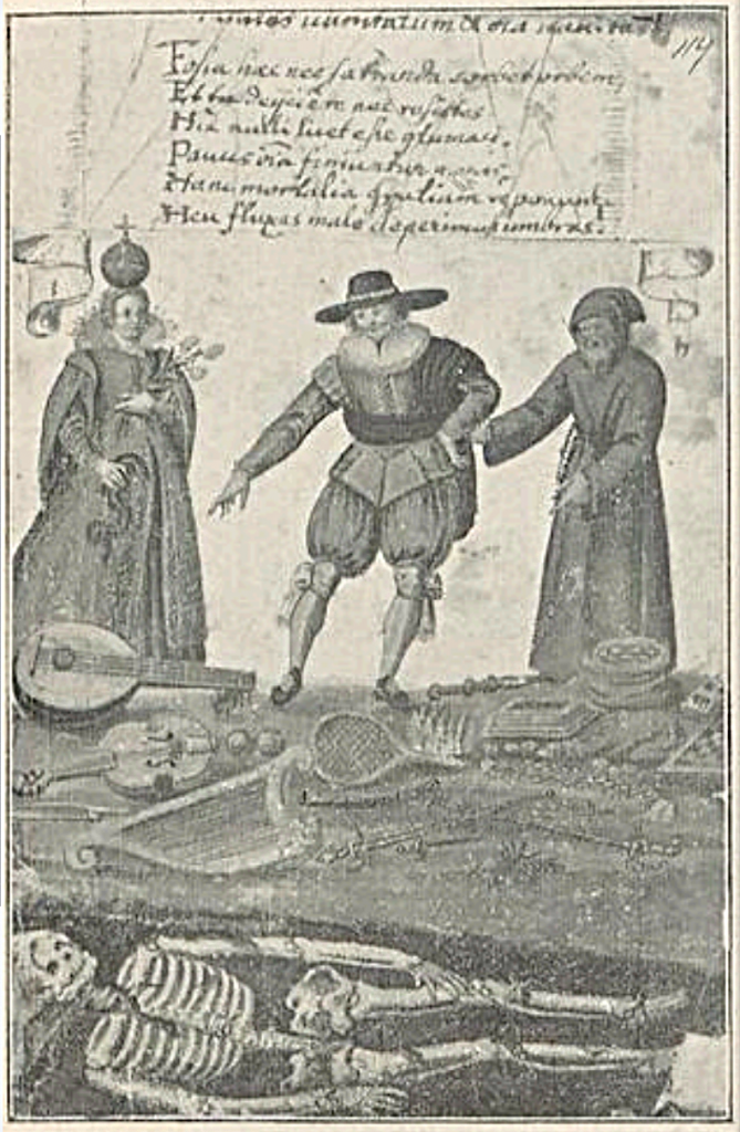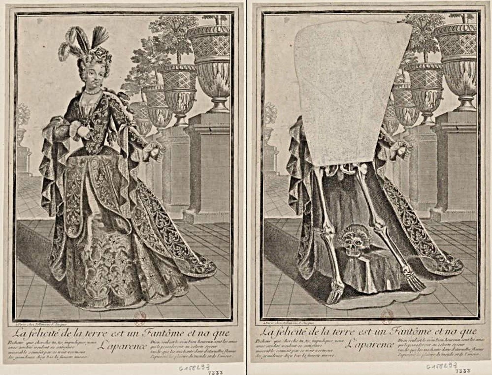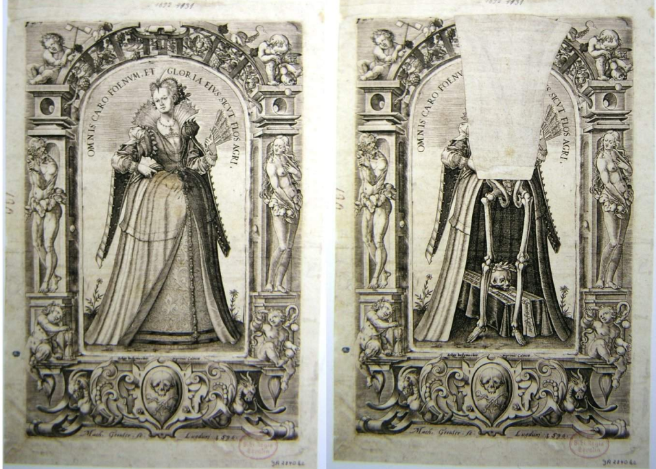 From the waist down the lifted flap reveals a skeleton with behind it, still within the compass of the skirt, a draped coffin with a skull on top — a classic memento mori. Again, this type is preceded by a print version