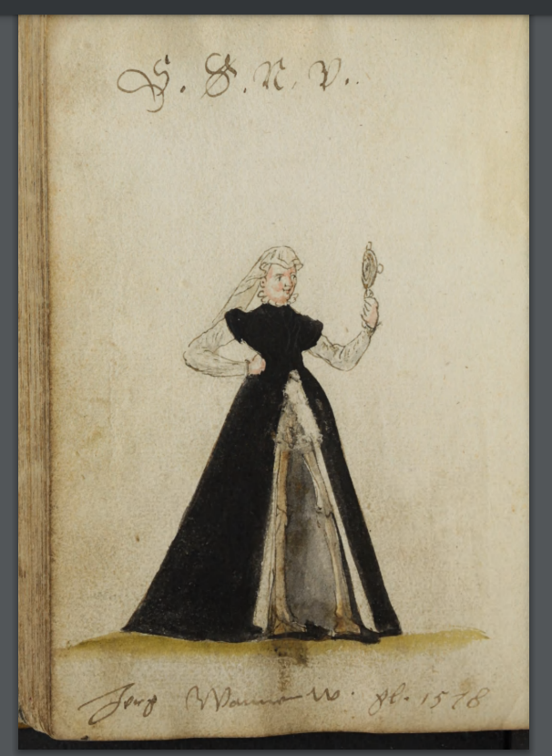 And here in an early lift-the-flap print is an early 16C German lady who looked in her mirror: