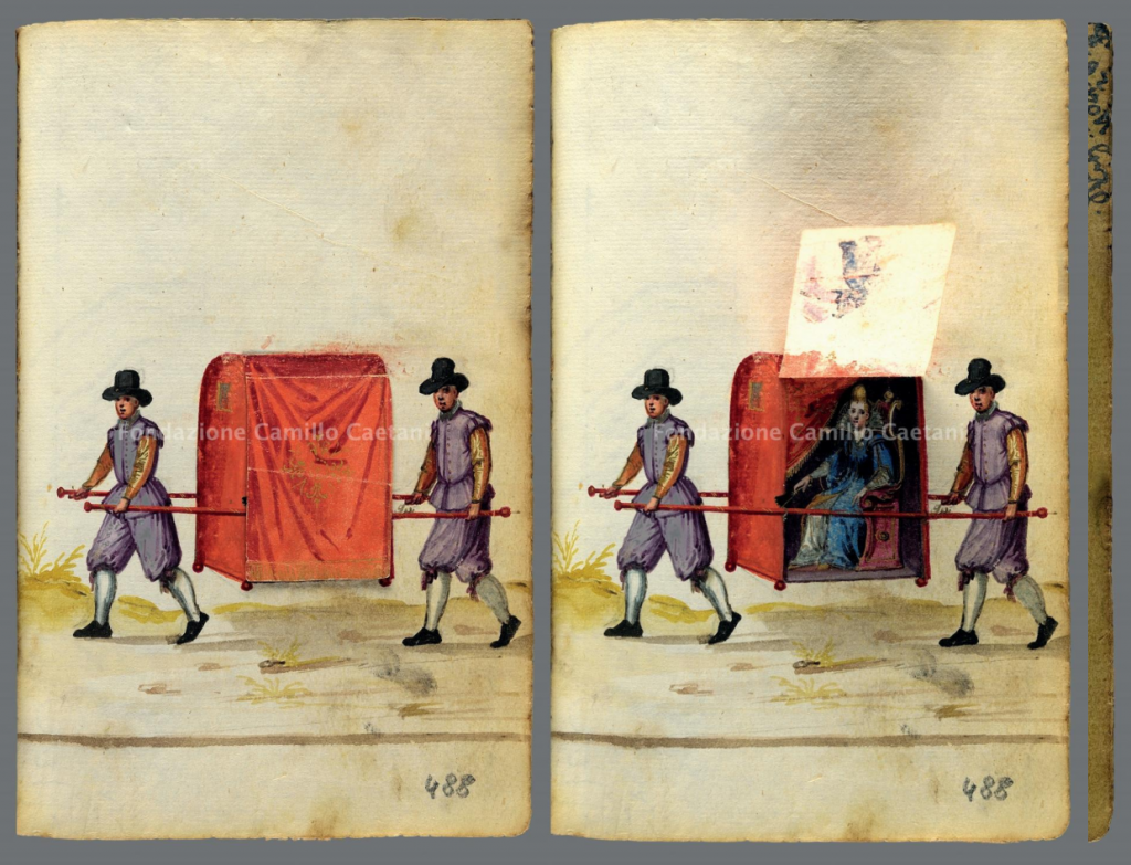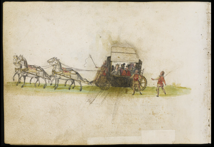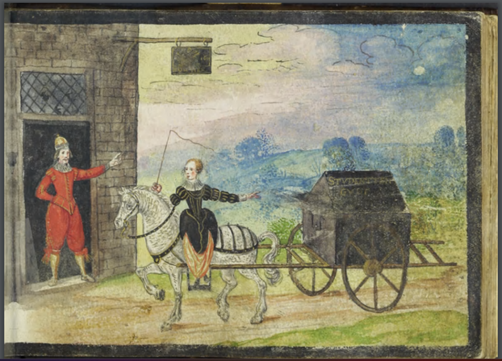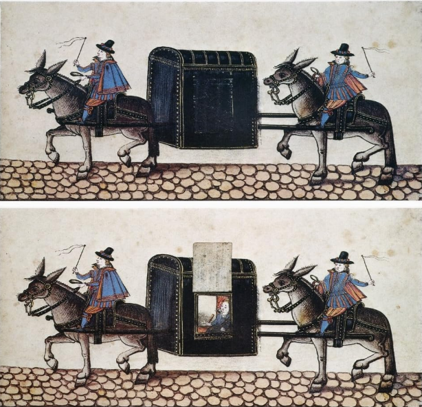 A leaf from a collection in the Folger Shakespeare Library — part of a series either intended for or extracted from an album — shows a mule-drawn litter: