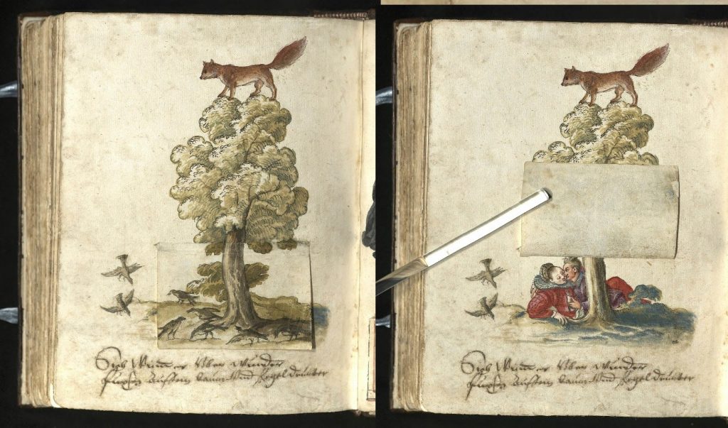 I discuss the scene below — the flap missing, as so often — in the album of Matthias Huber dated 1633. The dildo is missing now too — erased by a later owner!