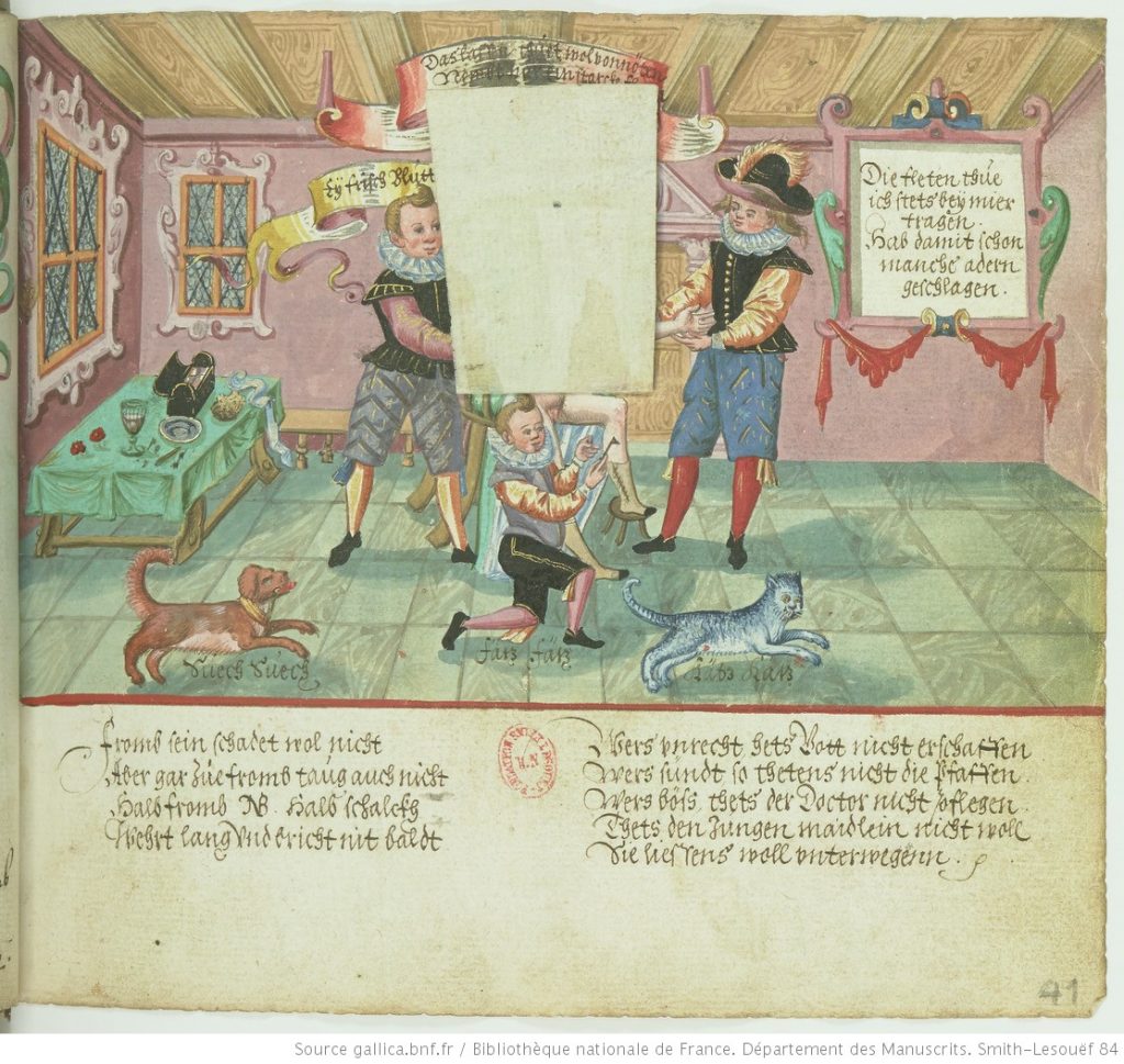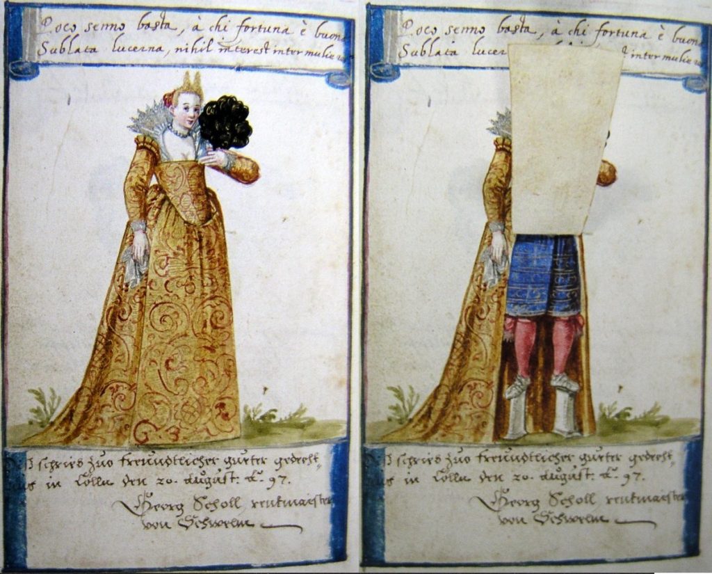 A fairly low-tech, supplementary amusement to be found in many albums is the painting which includes a liftable flap over some portion of the image, e.g. a woman’s skirts, and we have already noticed the small musician literally fiddling under the voluminous skirts of the famous Fat Woman of Strasbourg. In the example in the album of Rhaban Giese (below), the flap — as so often — is missing.