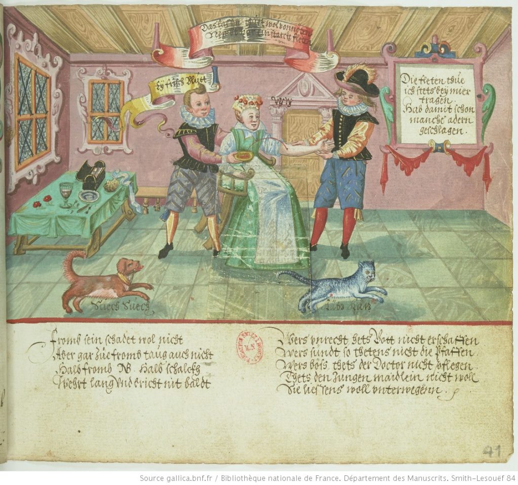 The Neithart album example (1598), a close copy of the de Bry engraving, is accompanied above the image by the speeches of all four participants. Again, the slight damage to the miniature above the girl’s head shows where the flap was once attached: