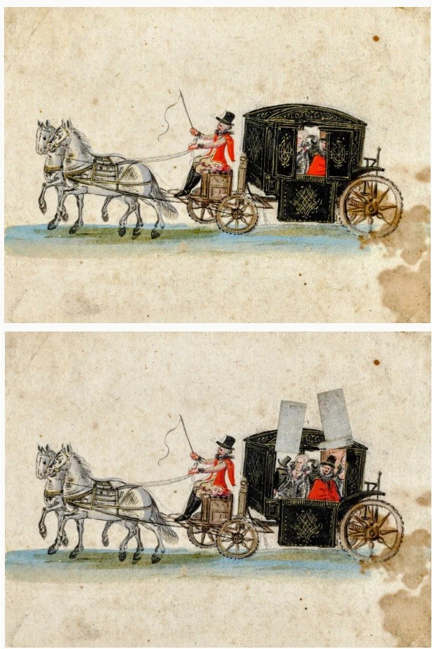 Much less frequent, but essentially the same, are miniatures of couples revealed embracing in carriages and litters — and not always in an Italian setting. Again, the inspiration was the Bertelli prints