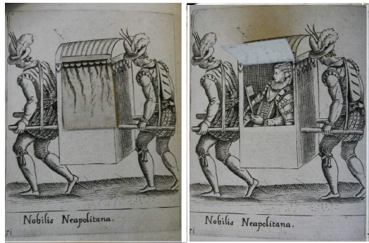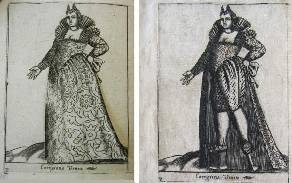 Venetian courtesan from Pietro Bertelli Diversarum 1592 (left) with flap down (right) with flap missing [from Karr Schmidt 2017]