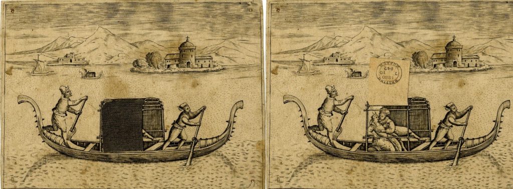 So popular were the lift-the-flap gondola miniatures from the 1590s onwards that, after the first dozen or so, I gave up collecting them. Like the lift-her-skirt Venetian courtesan on her chopines, they begin with the Bertelli prints of c.1588