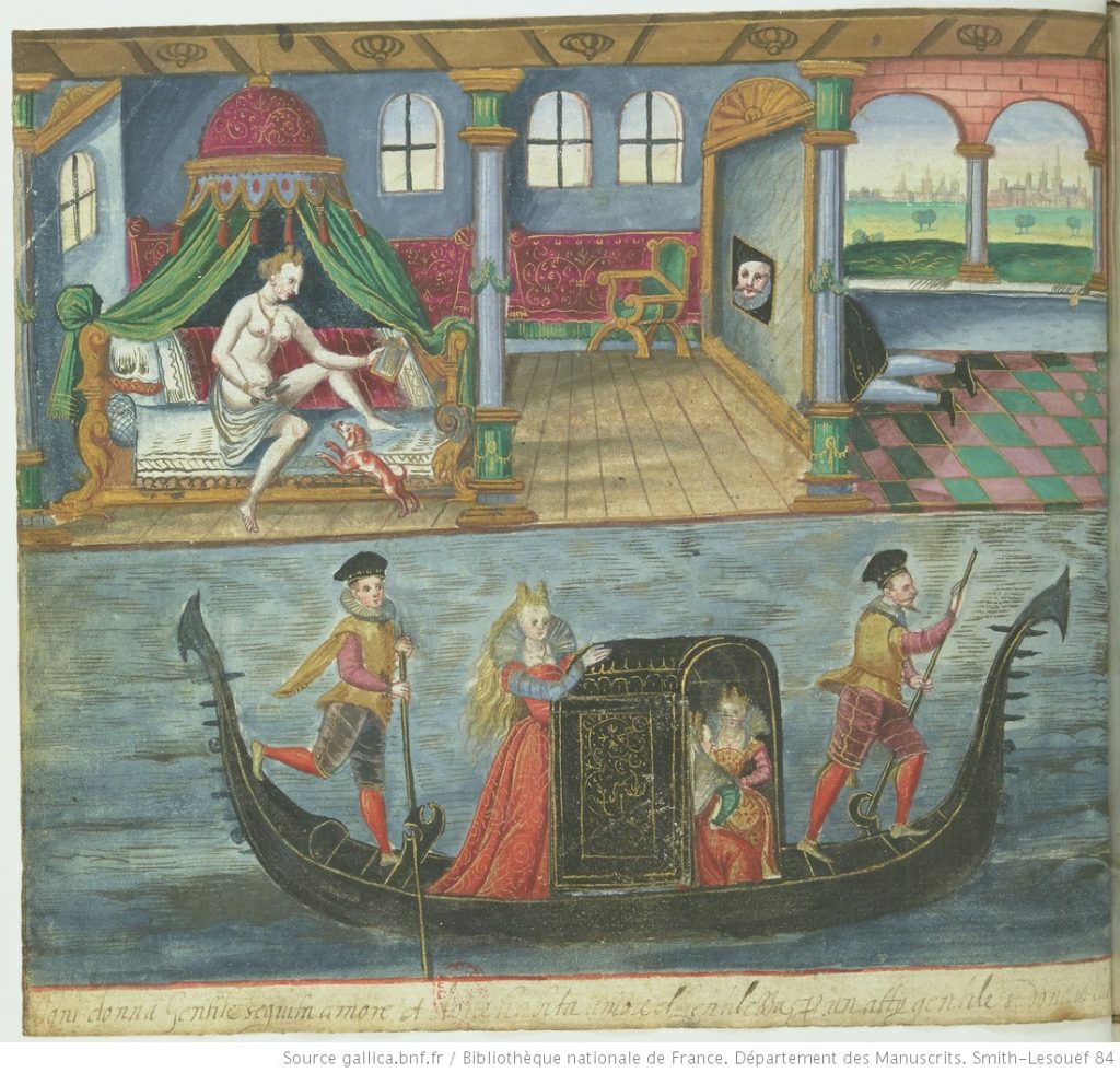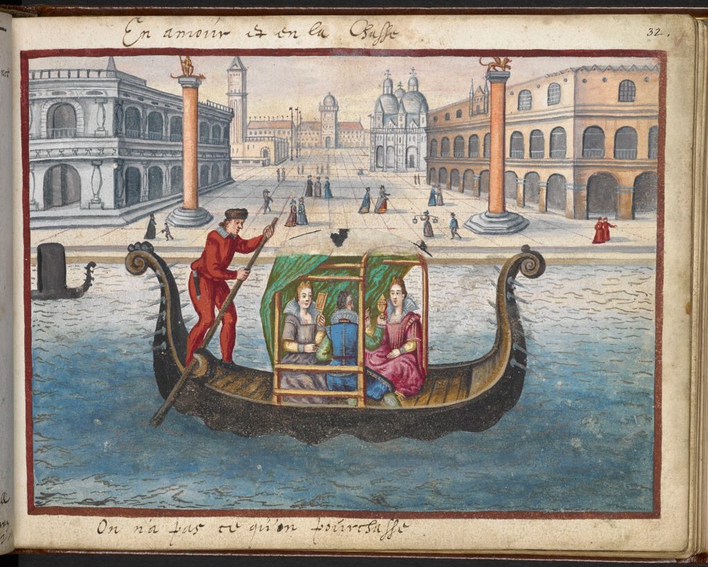 Below the gondola scene, the Italian caption opens, Ogni donna Gentile seguita amore [every noble lady followed love…], whereas in the Walens album, the (now lost) flap lifts to reveal another young German on his peregrinatio academica, widening his education in the company of two Venetian courtesans on the canal in front of the piazza San Marco, but is captioned in French: