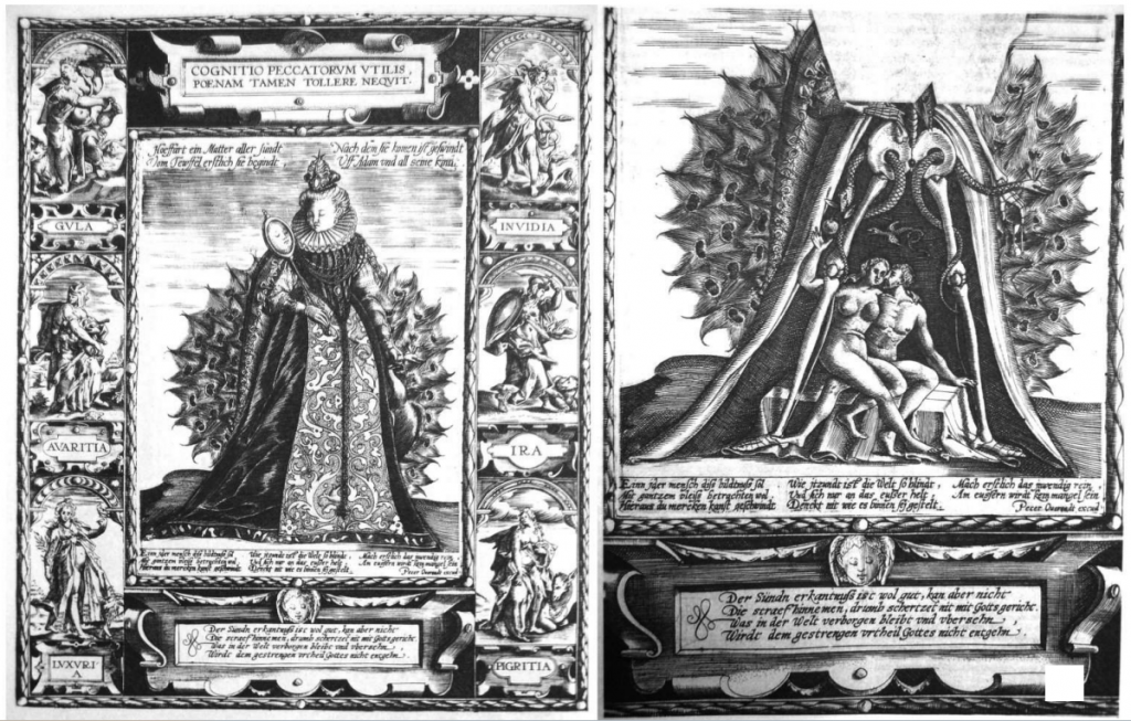 but in place of the skull and coffin seen in the Steinweg album painting, here it is Adam & Eve revealed hiding under the Lady’s skirts, as if attempting to hide from God in the Garden of Eden. Conrad Goltzius engraved two such undated print versions, one [EXTERIVS PICTA SVMQVE INTERIVS MALEDICTA (I am painted outside and cursed within)] published by Bussemacher in Köln, and the other [COGNITIO PECCATORVM VTILIS (it is useful to know your sins)] by Overraat, also in Köln.