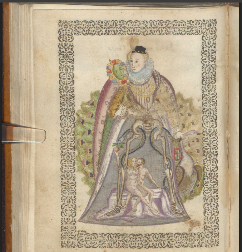 also includes such a lift-the-skirt miniature, dated 1578, though yet again, the flap has long since been lost. The young woman is shown admiring her beauty in the mirror, and like us, forgetting the evidence of mortality to be seen under her skirts.