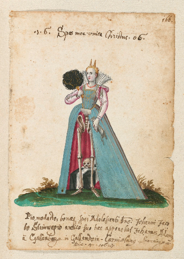 A surprise of a quite different sort awaited the viewer who lifted the — now missing — flap over the skirts of the courtesan on another leaf dated 1606 from the Steinweg album in the Frommann collection — though the obviously religious sentiment written above her head Spes mea unica Christus [Christ is my only hope] might perhaps have given a hint.