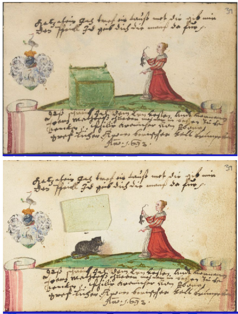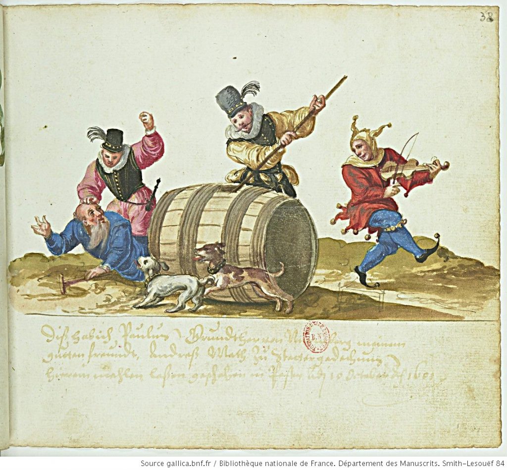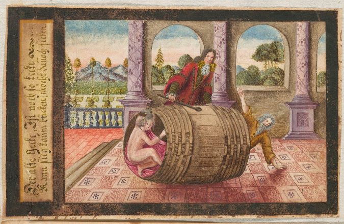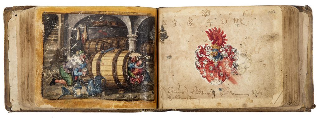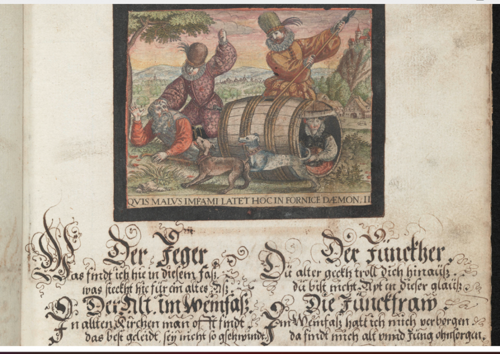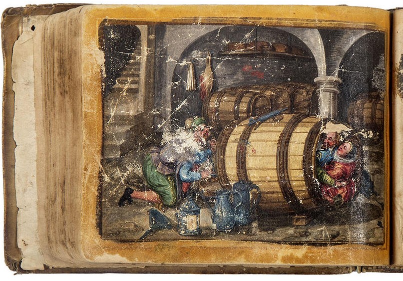 The only other lift-the-flap scenario to exist in multiple copies is the fabliau known in German as the Weinfaβschwank. The flap — now often missing — is lifted to reveal a young woman, or a young woman in the arms of an old man. In the three-person version, the cellar-owner/landlord discovers his young wife in the arms of an old man at the end of a wine-barrel — as in the album of Loth von Weiβenbach (1580-1623) now in the Zwickau Library (below). The damage to the painting, where the flap formerly glued to the end of the barrel has come away, can clearly be seen.