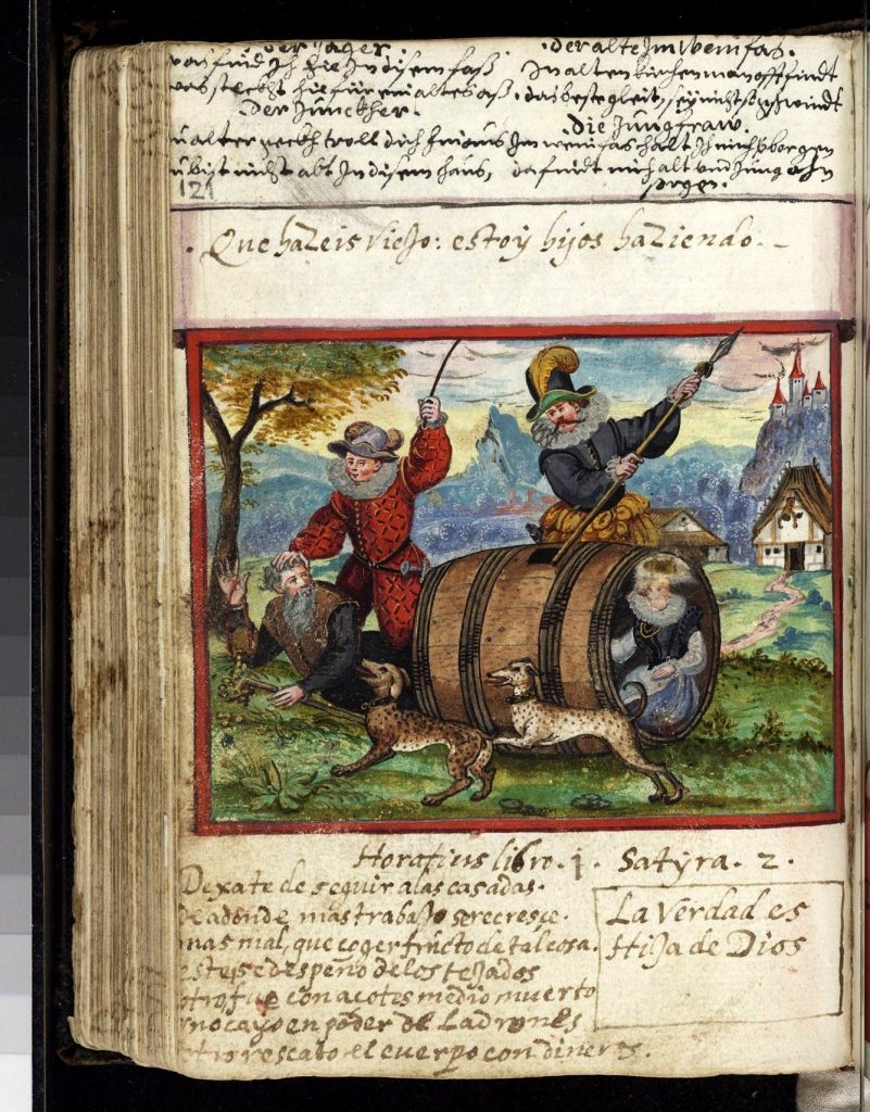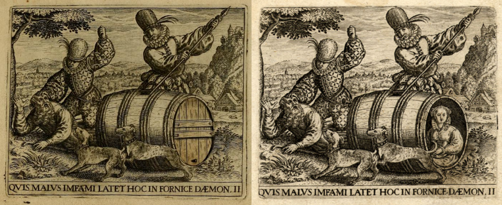In the more complex version, the barrel is situated — bizarrely — in open countryside, a huntsman has thrust the butt of his boar-spear through the bung-hole of the barrel, which has flushed out an old man from the end of the barrel, who is being beaten by his comrade. This too is based on an engraving by de Bry first appearing in his Emblemata Nobilitati (Frankfurt 1592):