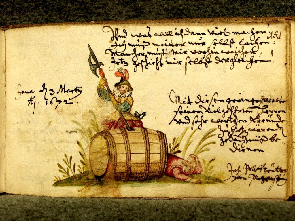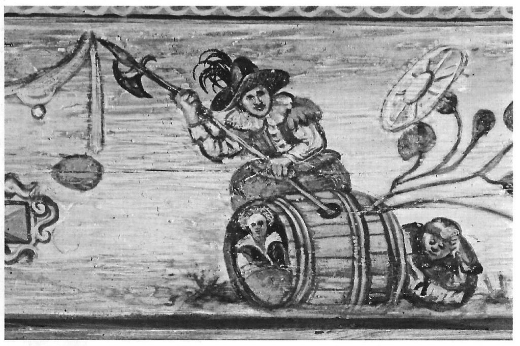 Contemporary with the turn-of-the-century miniatures — though obviously without a liftable flap! — the Weinfaβschwank is one of the motifs painted on the Wroclaw ceiling, providing a much-needed terminus post quem for that decoration: