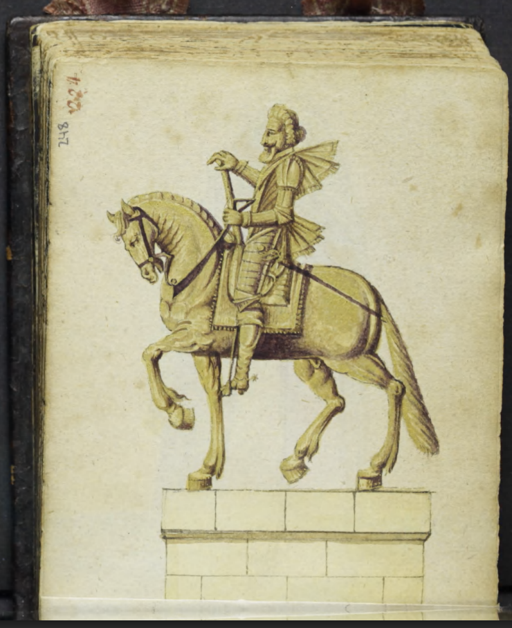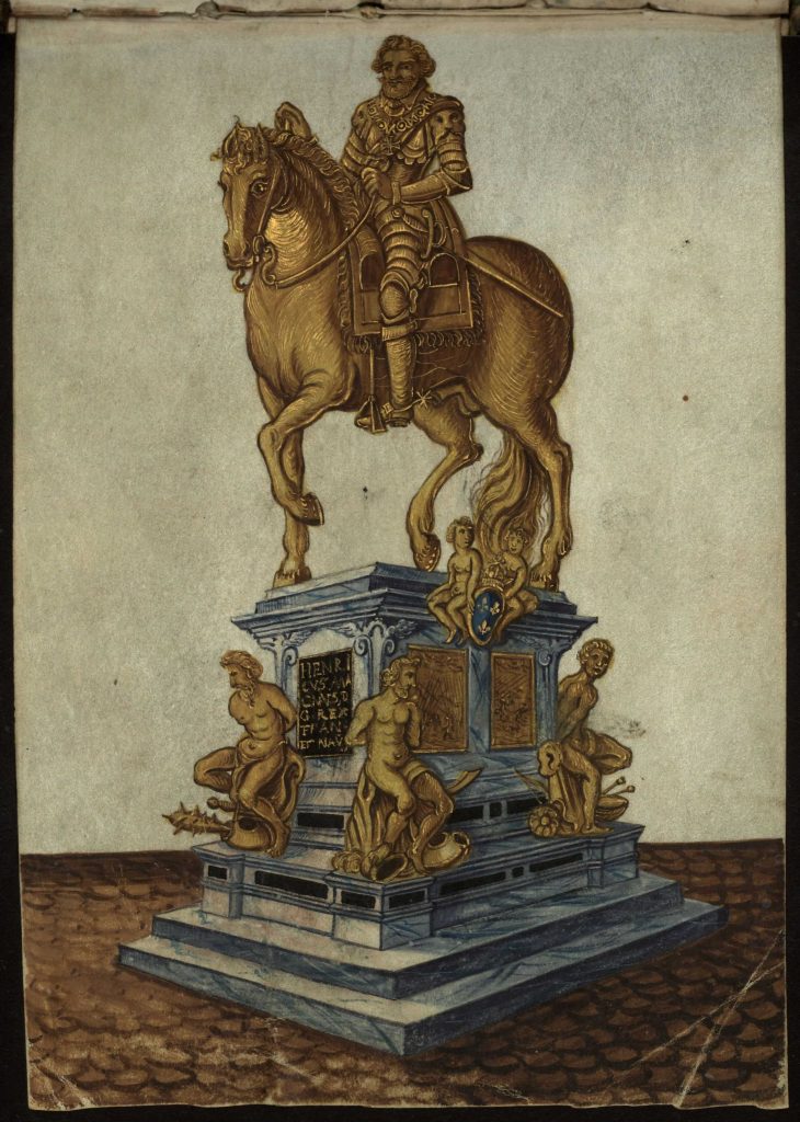 Mary of Medici, commissioned an equestrian statue of her murdered husband, King Henri IV to be erected on the Pont Neuf in Paris — it was completed in 1614. Five years later, on his trip across Europe, the Silesian nobleman, Herman of Salza, had a meticulous copy of the monument painted for his album: