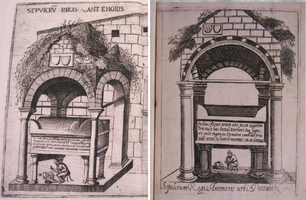 It seems likely that there is some relationship to these prints of the tomb issued in Padua by Pietro Bertelli in 1588 and 1596 in which the little cobbler also appears: