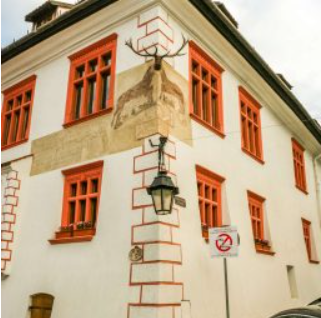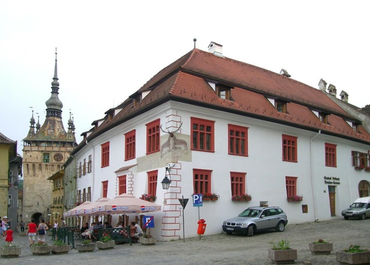 Precisely the same arrangement can still be seen today on the corner of the building in Sighisoara, Romania, the feature which gives it its name, indeed — Casa cu Cerb [house with the stag] — and there can be no doubt that in both cases the intention was apotropaic, to ward off evil.