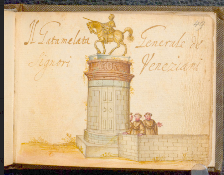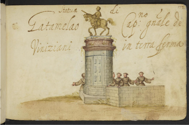 and Donatello’s quattrocento equestrian statue of the condottiero Erasmo da Narni (nicknamed Gattamelata), labelled Statua di Gatamelao [sic] Cap[ita]no g[ener]ale di Viniziani in terra ferma [statue of Gattamelata Captain General of the Venetians on dry land].