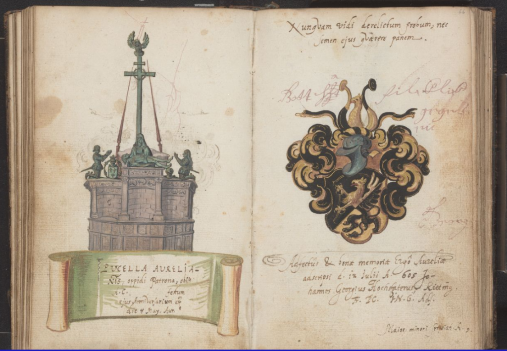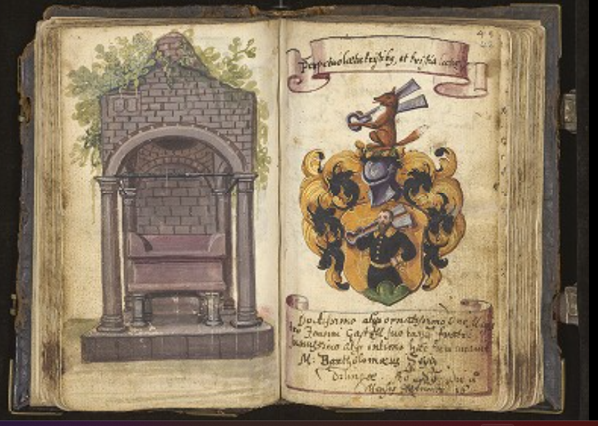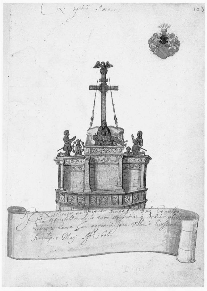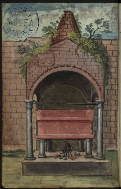 An earlier image of the monument (which I have not seen) was painted on f.119r. of the album of Emmeran Riz von Grueb in 1585, and an engraving of it pasted into the album of Conrad Mithoff at some point between 1590 and 1617 [both these c/o RAA].