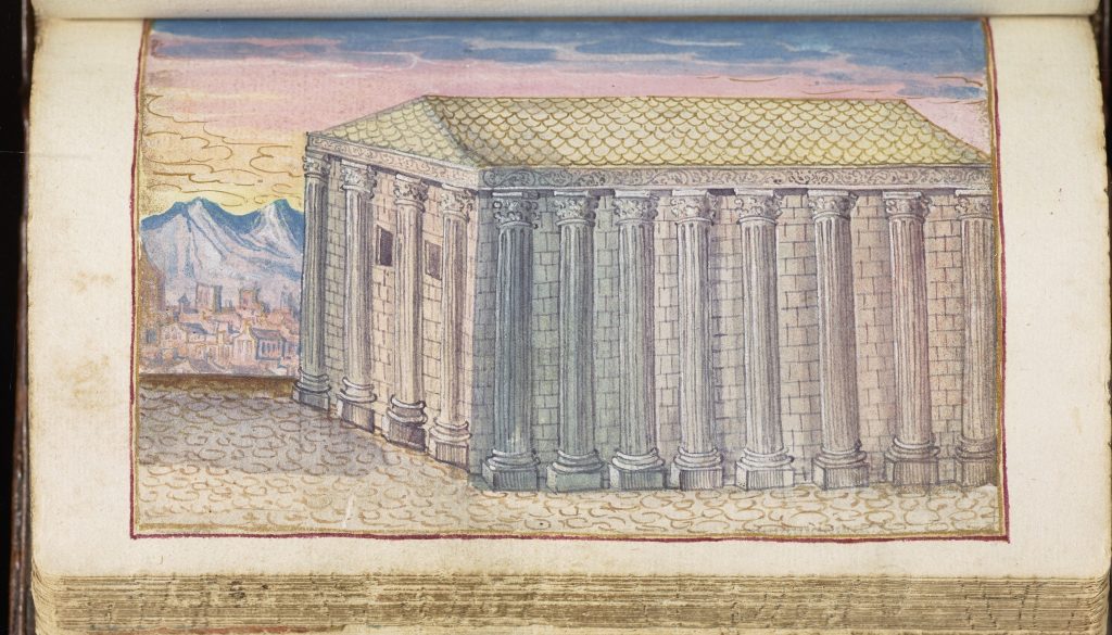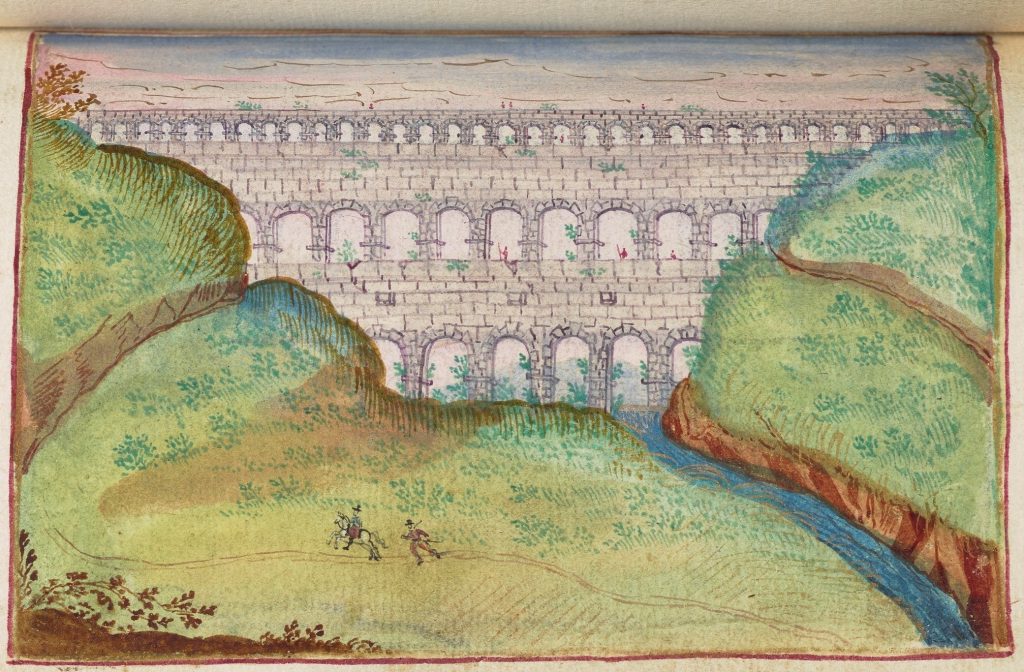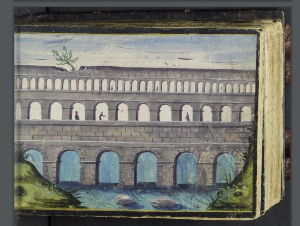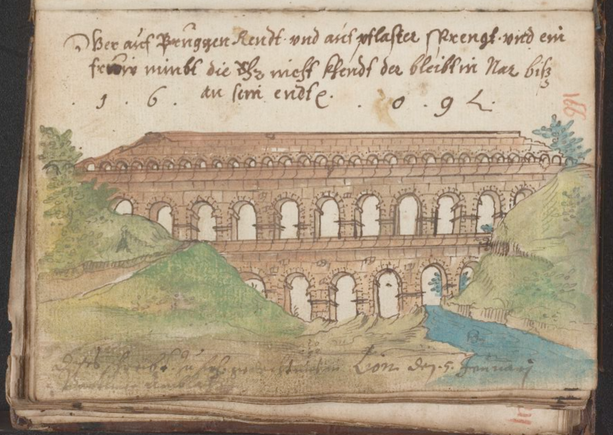 But Roman monuments outside Italy attracted attention too: The magnificent Pont du Gard aqueduct at Nîmes was painted in at least three albums, those of Renner (1609), Gruber (1602-12), and Rentsch (1615-47).