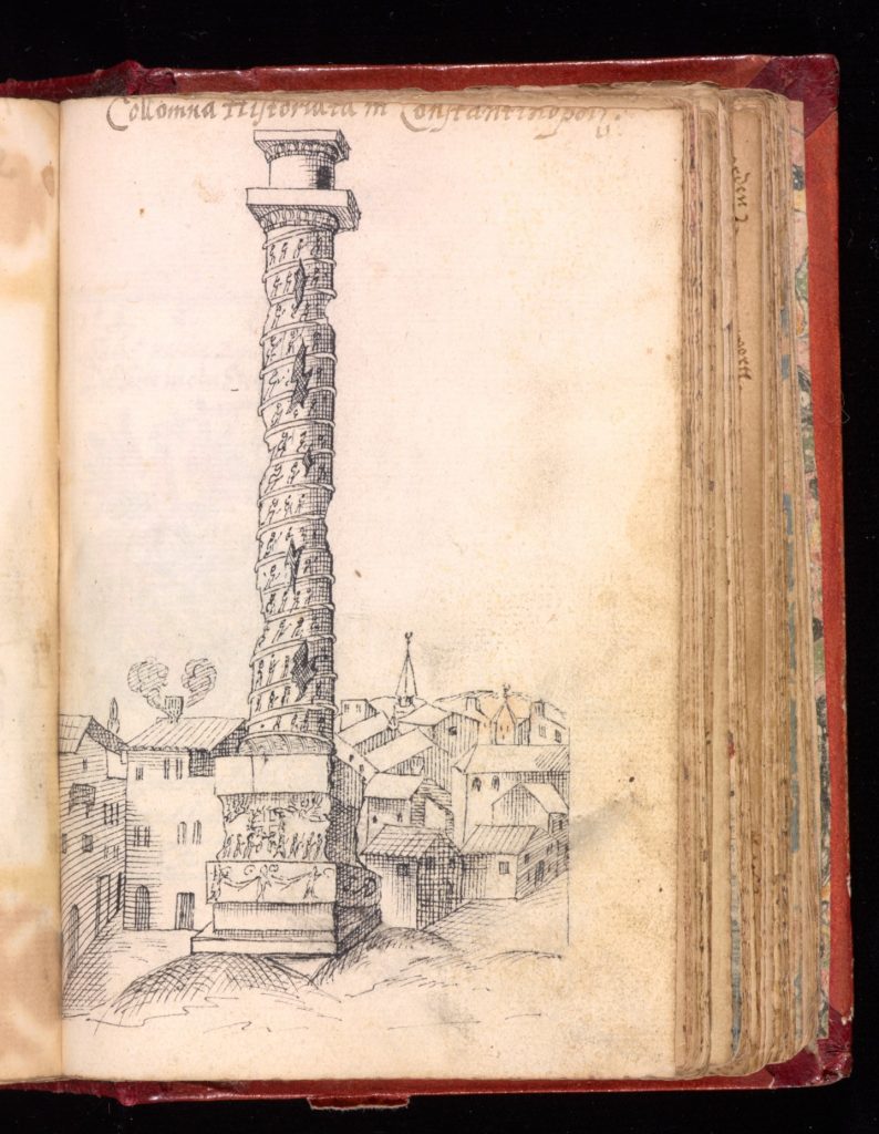 The celebrated Column of Constantine in the centre of Constantinople was painted in the Plan album in 1578 — its porphyry perhaps coloured a little too purple here —