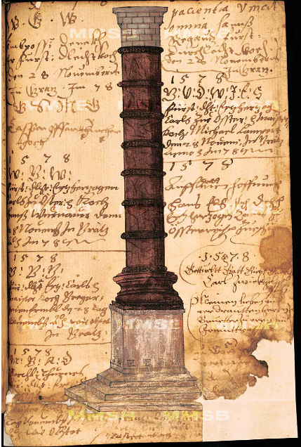 and the Column of Arcadius in the same city, labelled, Collomna Historiata in Constantinopolis, was painted in the Prack von Asch album (dated entries 1587-1612).