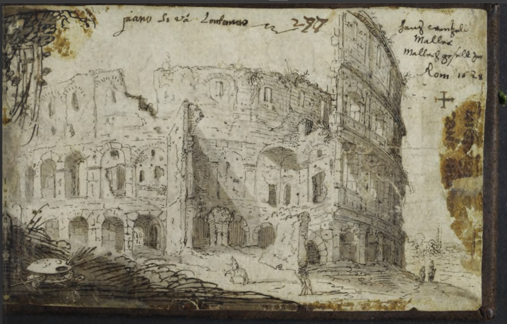 One of the two albums kept by the Viennese painter Samuel Peltz includes this drawing of the Colosseum dated 1628,