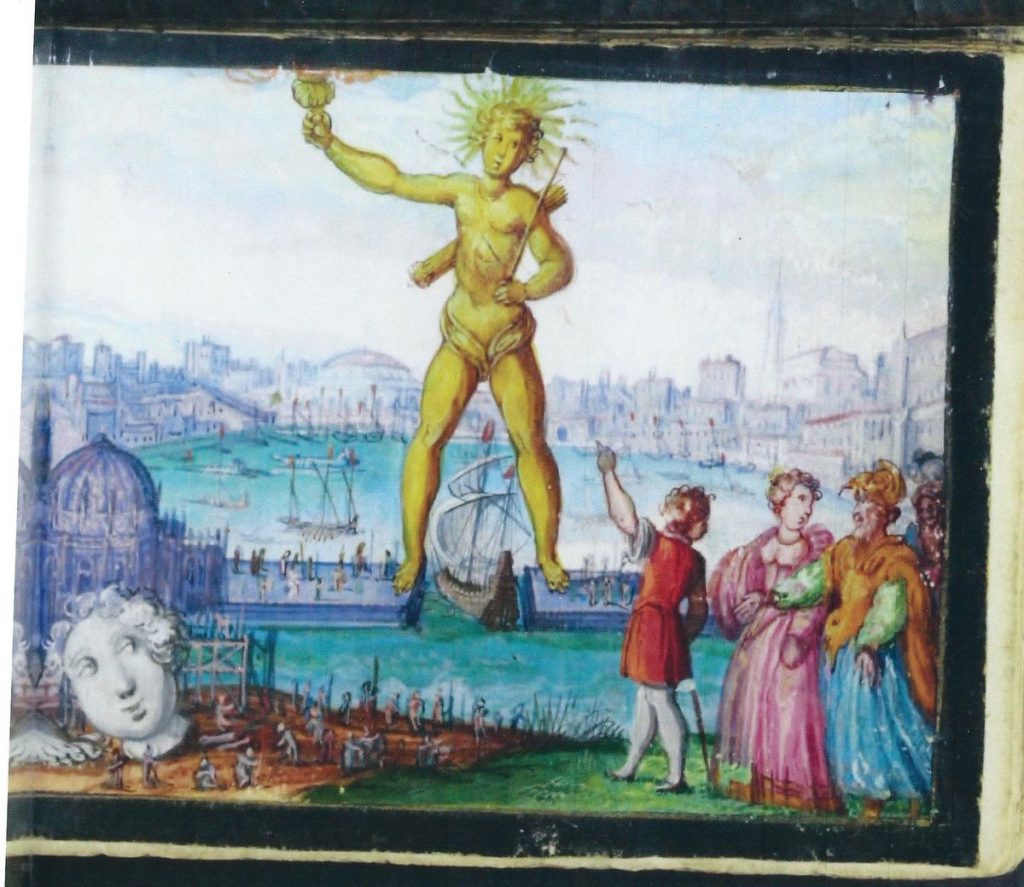 This miniature in the Rentsch album purports to show one of the Seven Wonders of the Ancient World, the Colossus of Rhodes, with the seemingly archaeological remains of it — head and foot — in the foreground, but the album painter has merely made a fairly free copy of an engraving by Crispijn de Passe