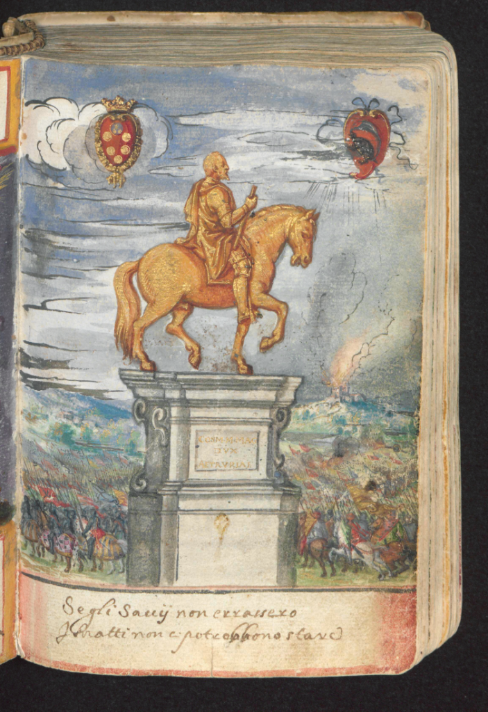 An equestrian statue of Cosimo was erected in the Piazza della Signoria in Florence in 1594 and subsequently painted in the album of Mattheus Miller: