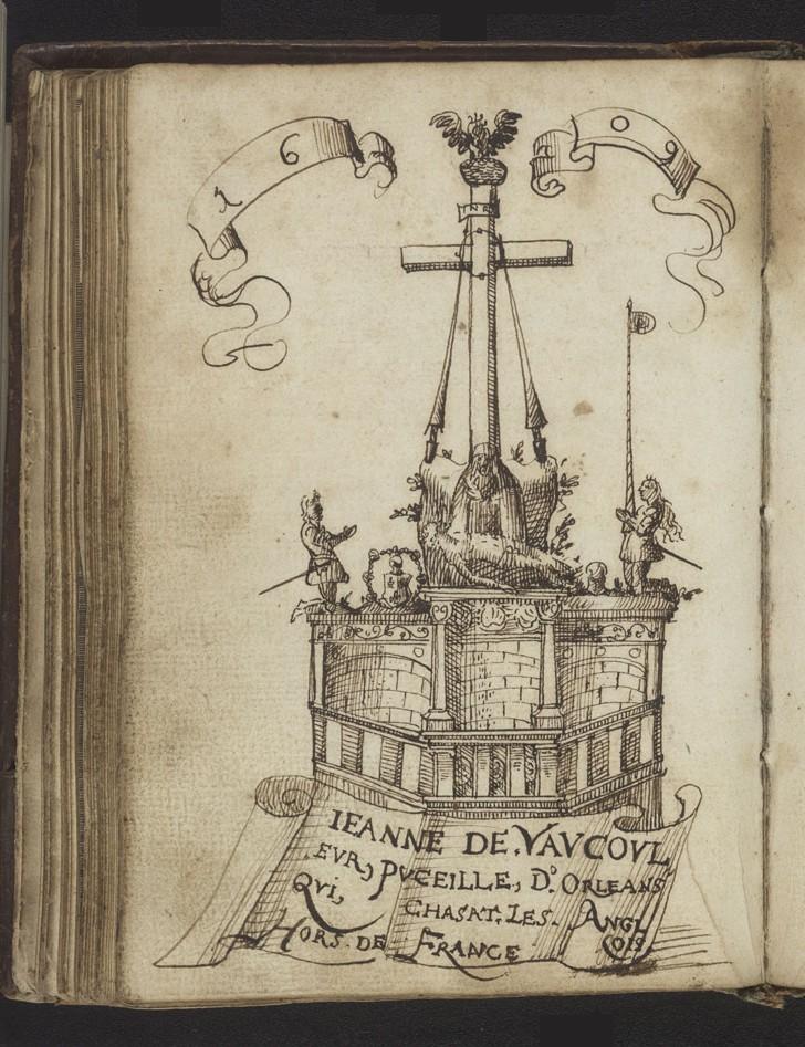 The Renner album label — in the vernacular — is rather more dramatic: Ieanne de Vavcovlevr, Pucelle, D’Orleans Qvi Chasat les Anglois Hors de France [Joan of Vaucouleur, Virgin, who Chased the English out of France]. (ABOVE)