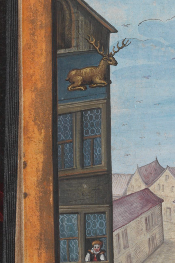 In this painted miniature the artist has included a fascinating and prominent detail just below the eaves on the corner of the building in the foreground — an apparently three-dimensional model of a stag, positioned so that its antlers project on both sides of the building: