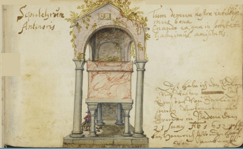 but the Berlepsch album features paintings of two medieval monuments in Padua — the late 13C Tomb of Antenor, legendary Trojan founder of the city (here dated 1612),
