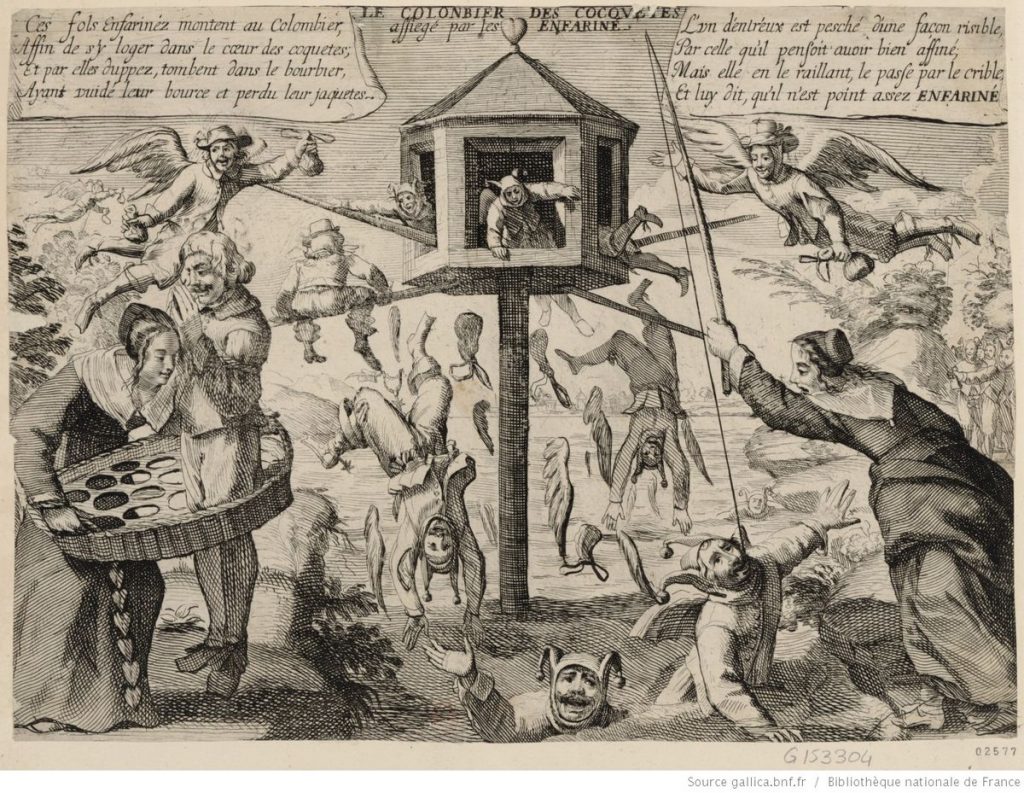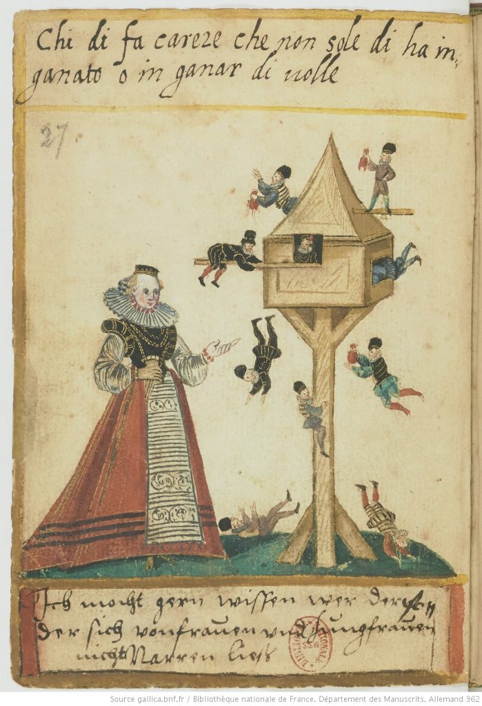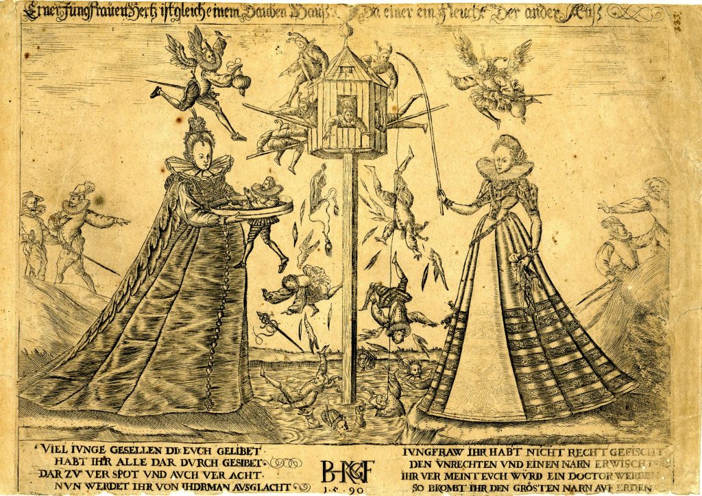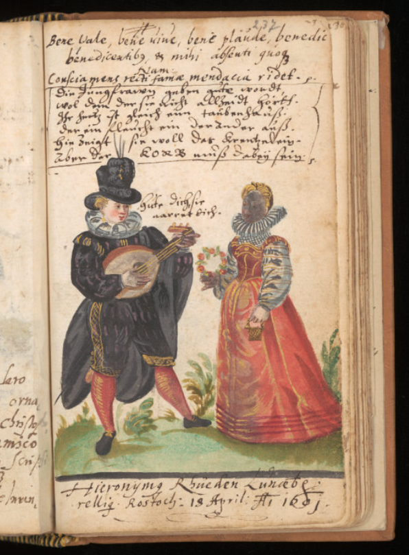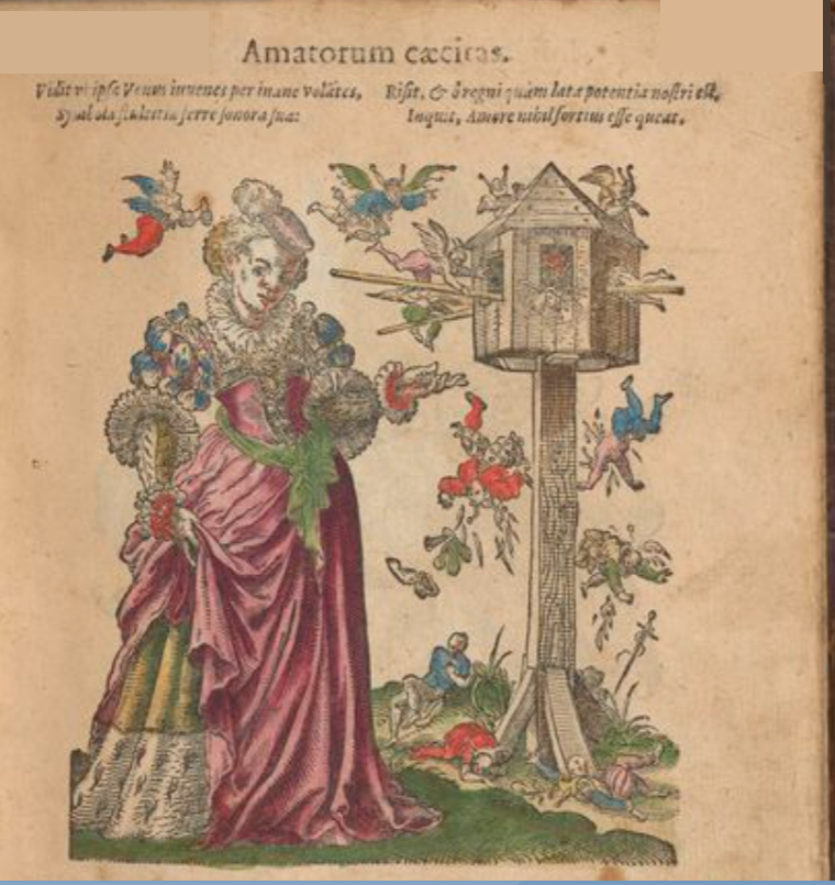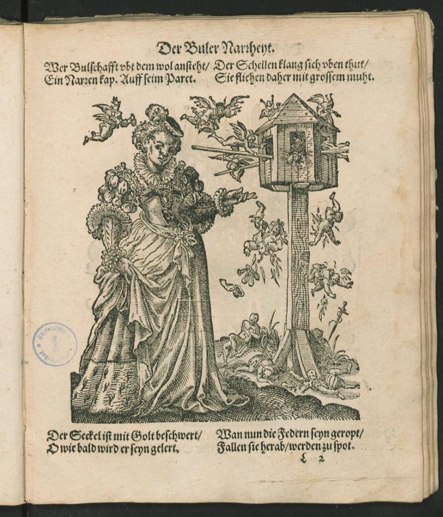 Jost Amman’s woodcut first appeared in 1579 in Feyerabend’s Stam und wapenbuch hochs und niders standts (Frankfurt 1579) one of the earliest printed books deliberately designed for the Stammbuch market — as used, for example, by Balduin von Knesebeck, from 1580. Here the cut is entitled Der Buler Narrheyt [the Folly of Lovers], but in Feyerabend’s similarly purposed Flores Hesperidum. Anthologia gnomica and Stamm- oder Gesellenbuch, issued the same year.