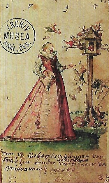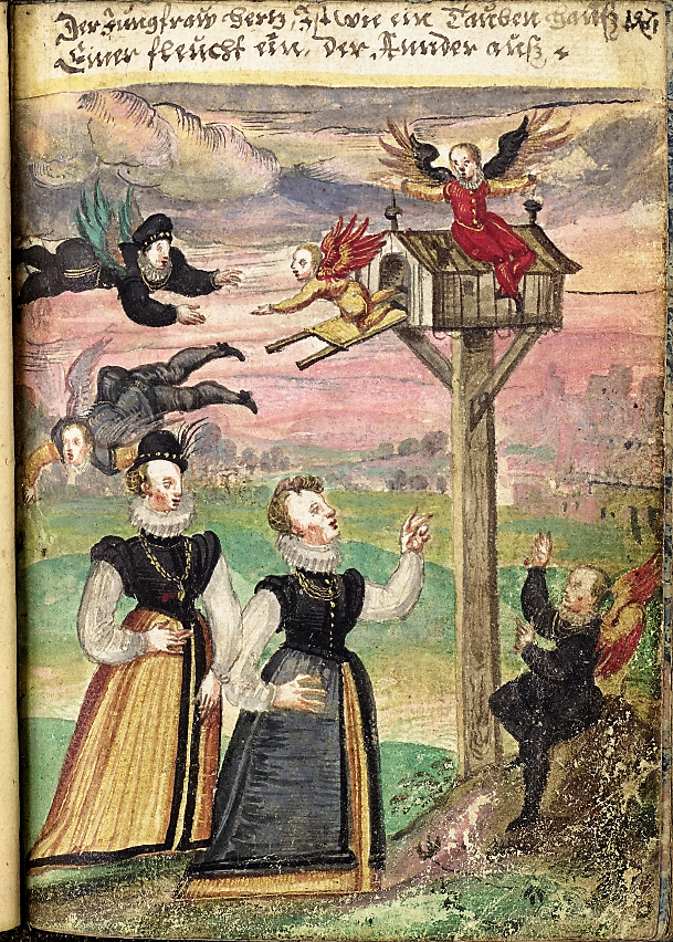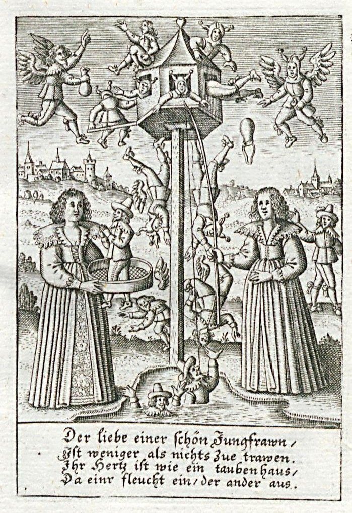 Though the Harsdorffer album does not include the image, the central couplet in the frame above the young couple here on this page dated 1601 includes the familiar rhyming comparison of the young woman’s heart to a dovecote: