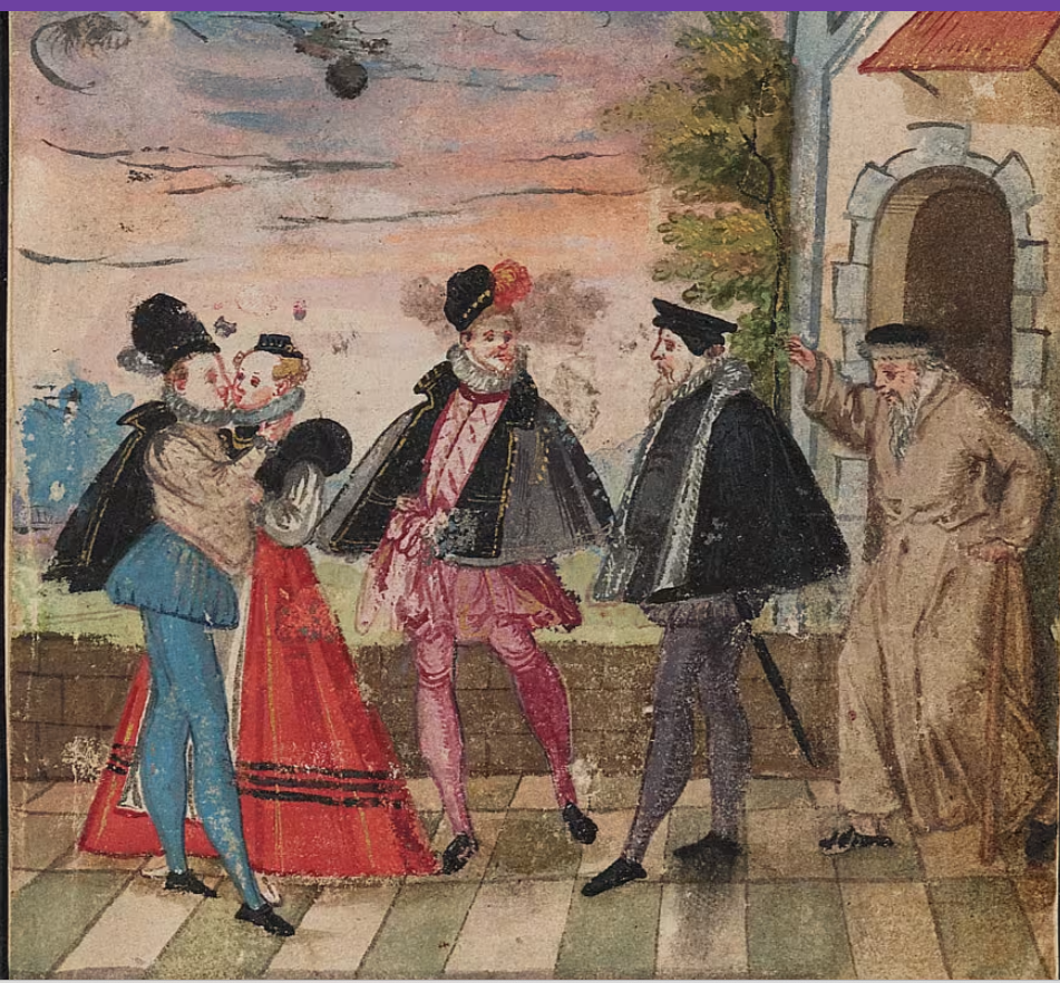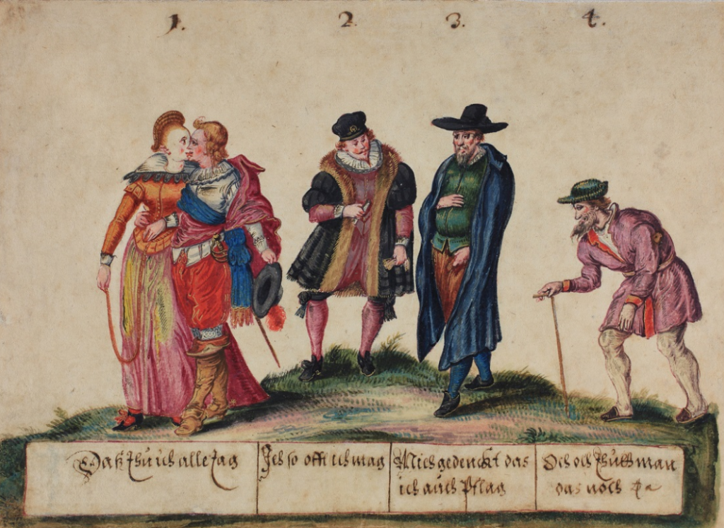 But back to our albums. Here is an orphaned leaf in the Bayerisches Nationalmuseum, there dated c.1580. No texts, but we cannot mistake the subject — as always, note the beard-length of the men which increases with age in this motif!